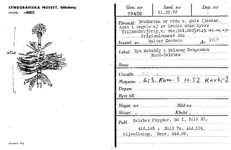ETNOGRAFISKA MUSEET, Göteborg ETNOGR. AlaffiX 95Oirl \.) Elanders, Gbg Gen. n:r 79408 Saml. n:r -51.23.93 Dep. n:r Föremål: Brudkrona av röda o. gula fjädrar. Äges i regeln ej av bruden utan Nyres Tillpenor: torig.n-. -26-o-,-26-1-i-26-257.-2-'3-.--49-4--;'44ila.7.-- 02' iginalnumer 24o Insaml. av: Walter Kaudern Är: 1917 Lokal: Byn Motoböj i Bolaang Mongondou Nord-Celebes ' Stam: Utställt: ... ,..-- - Magasin: 6 3-5 , Kulm - 3 H- 5- 2. k' v 4,-2 Depon: Byte till: Negat. n:r ' Bild n:r Skiopt. ., Kliché ., Publ. Celebes Obygder, Bd I, Bild 35, sid,lo5 ; Bild 7o,_ sid 194,, Oljemålning. Rem-. sid.88. [ocr]