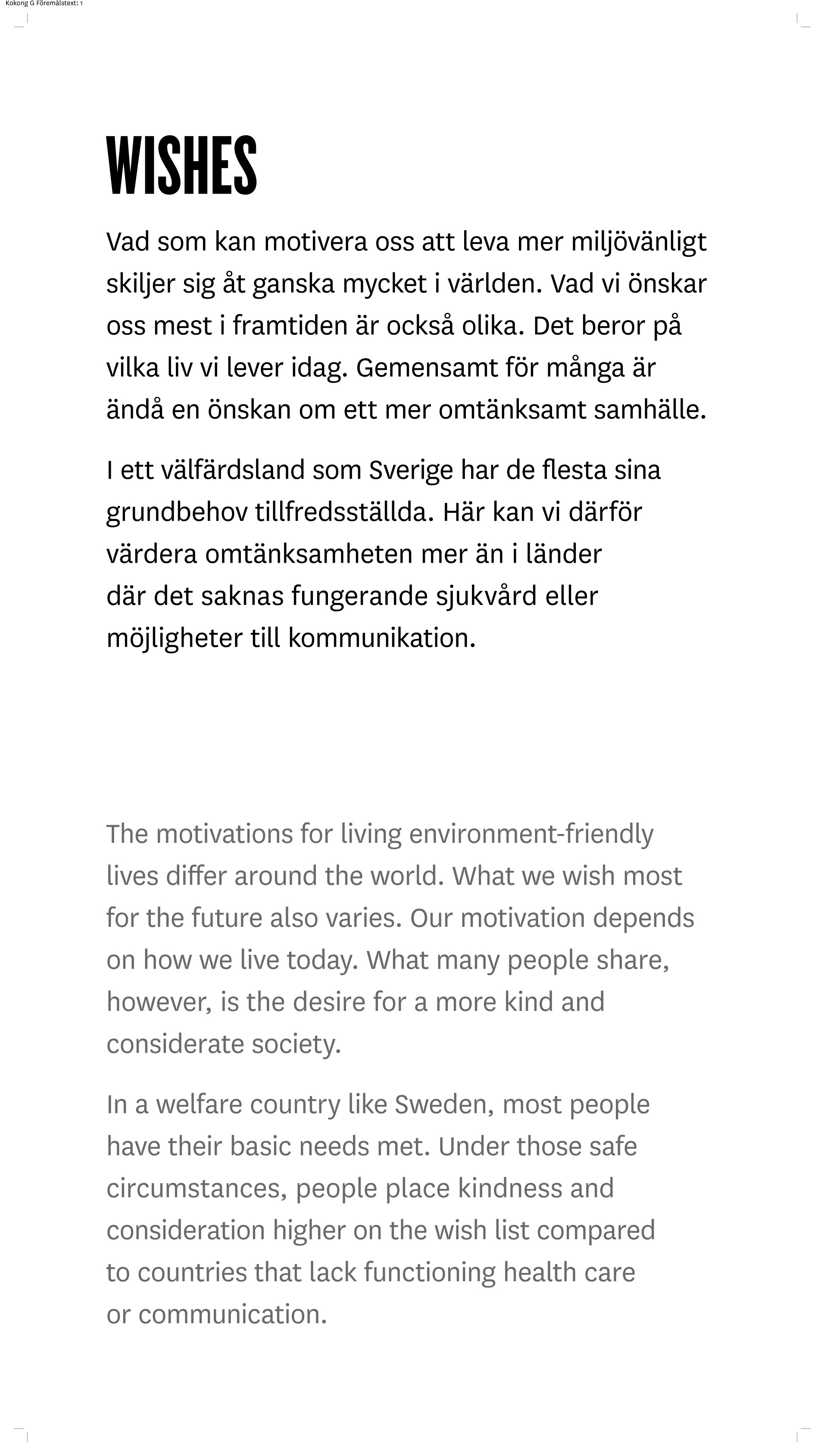 The motivations for living environment-friendly lives differ around the world. What we wish most for the future also varies. Our motivation depends on how we live today. What many people share, however, is the desire for a more kind and considerate society. In a welfare country like Sweden, most people have their basic needs met. Under those safe circumstances, people place kindness and consideration higher on the wish list compared to countries that lack functioning health care or communication.
