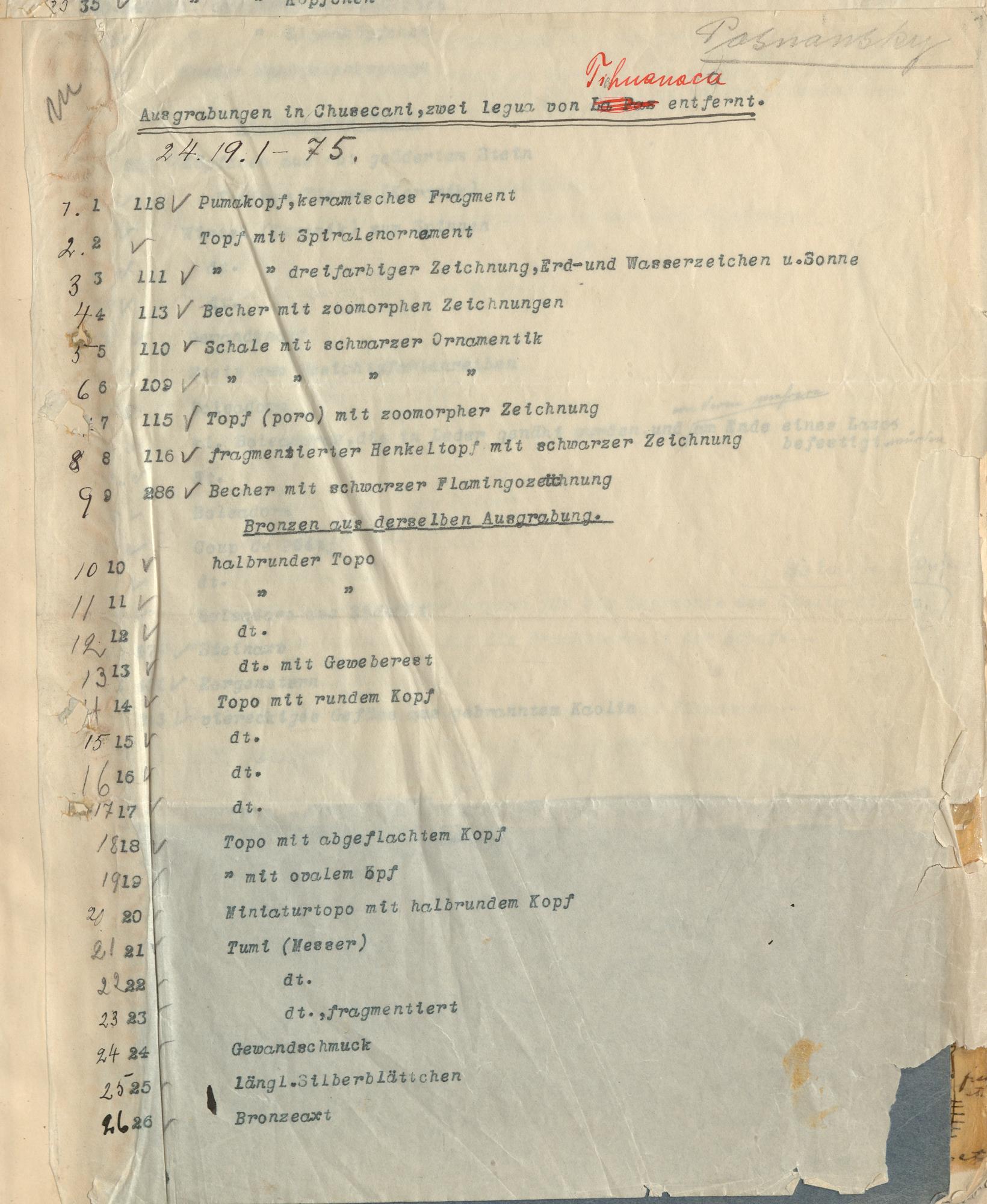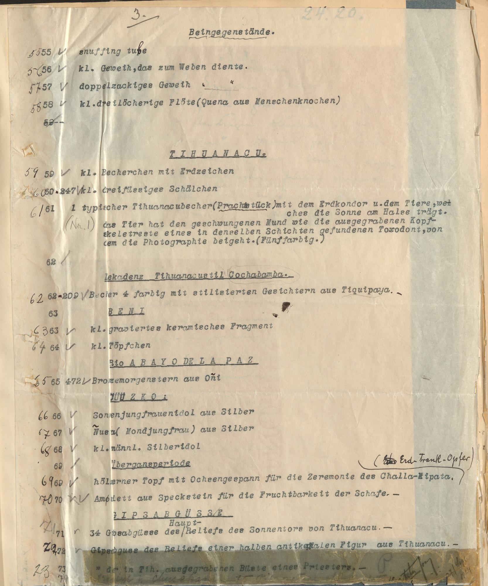 ARKEOLOGISK SAMLING från BOLIVIA gjord av Dr. Arthur Posnansky. Utgrävningar i CHUSECANI och andra lokaler 2 leguas, från TI/OHUANACO