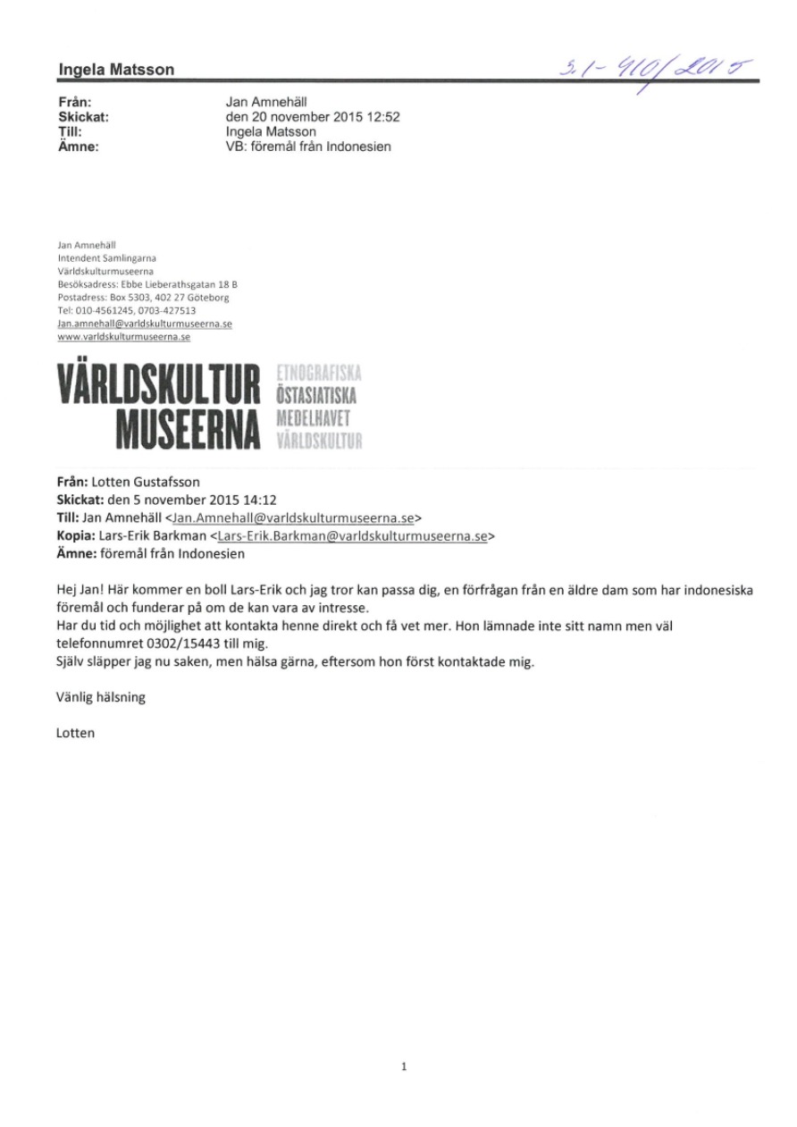 1. Kort beskrivning: Föremål från Indonesien insamlade kring 1960, två kriser, ett kort svärd, tre dansmasker från Java. Två träskulpturer och en dansdräkt från Bali. Fyra mindre kastspjut och en mand...