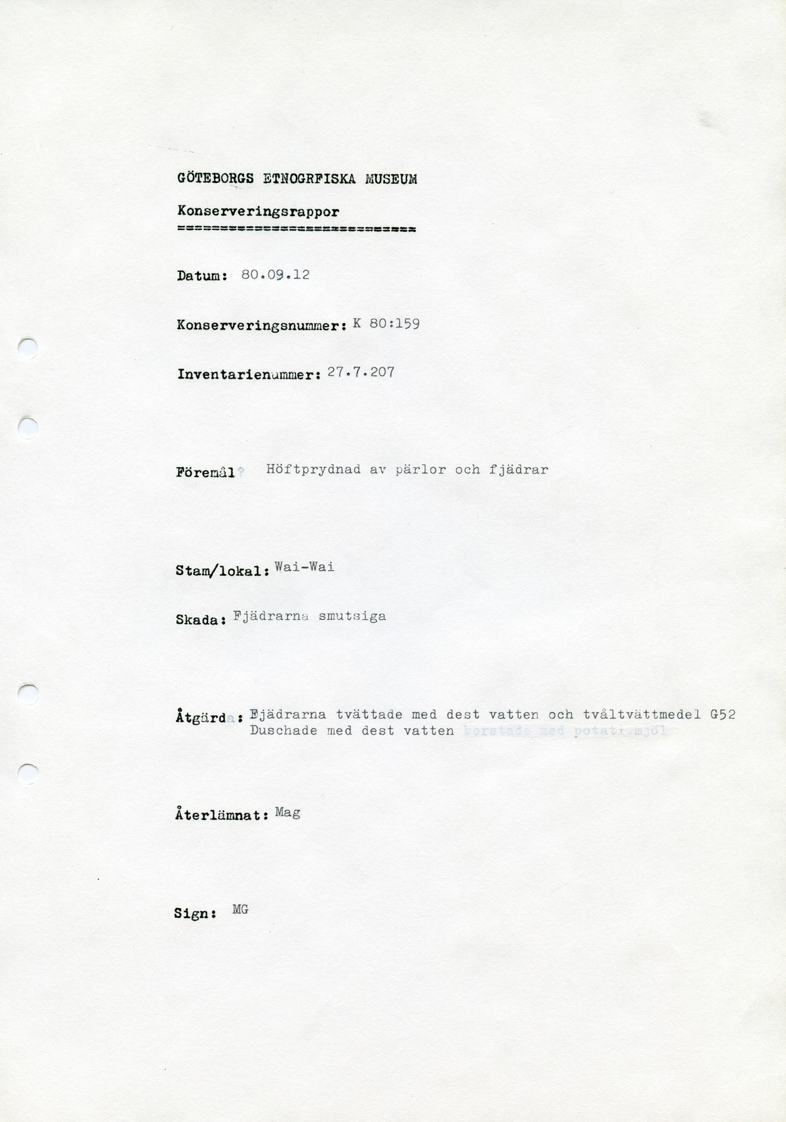 • Konserveringsrapport, Göteborg etnografiska museum (GEM).