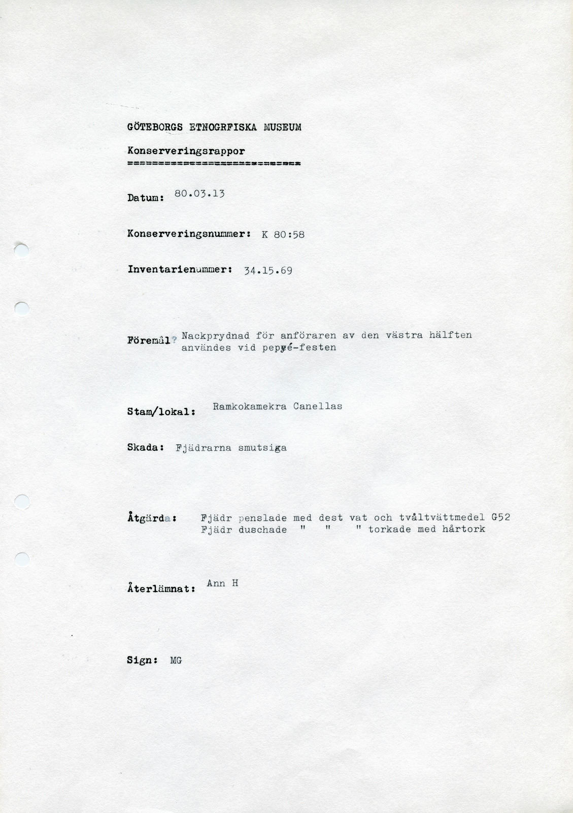 • Konserveringsrapport, Göteborg etnografiska museum (GEM).