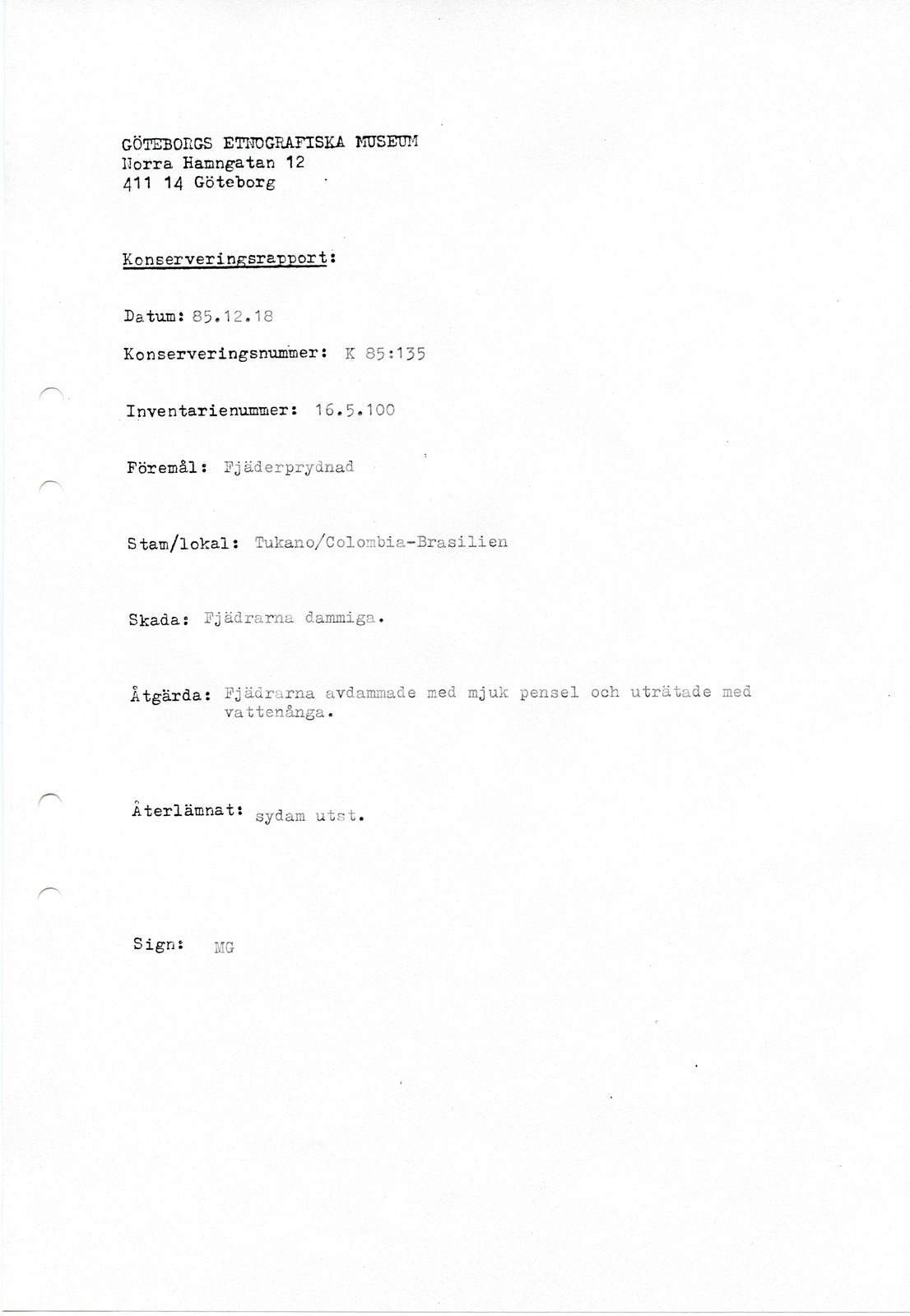 • Konserveringsrapport, Göteborg etnografiska museum (GEM).
