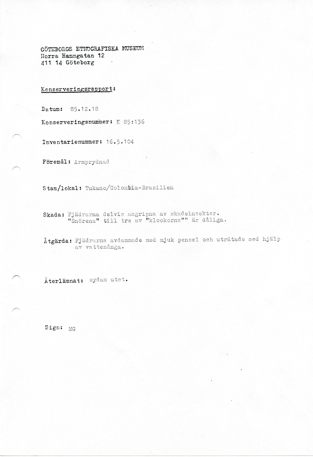 • Konserveringsrapport, Göteborg etnografiska museum (GEM).