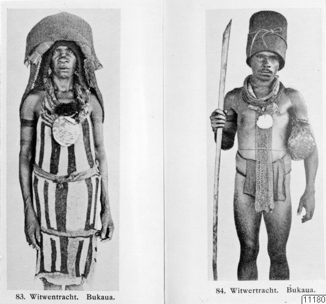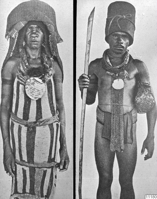 Motiv: Kvinna och man klädda i sorg. Lokal: Nya Guinea. Foto för skioptikon. Foto: fotograf okänd, datum okänd. Erh: gm. köp av Dr.W. Kauderns bildmaterial, 1947. Publ. R. Neuhauss: Deutsch-Neu-Guinea. Berlin 1911, fig. 83-84. (katalogkort).