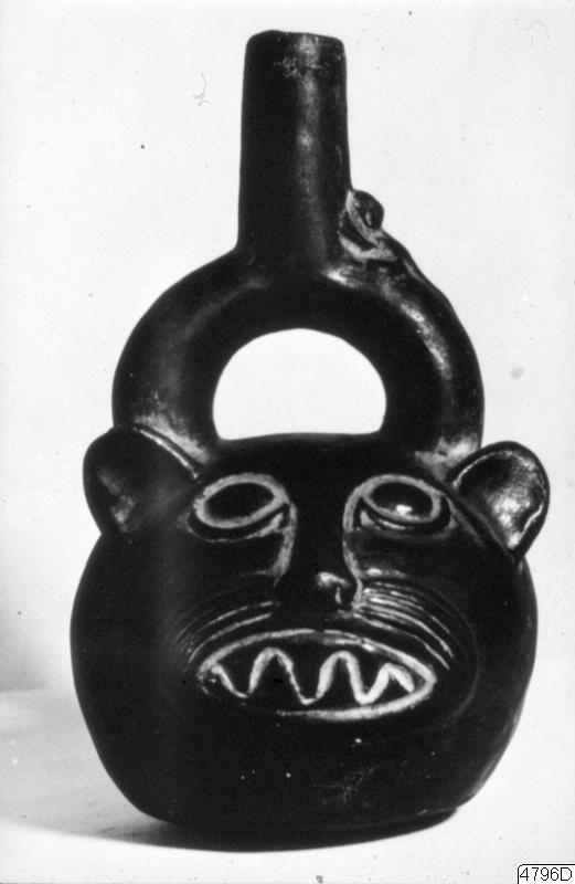 Zoomorf lerbygelkanna i form av ett jaguarhuvud. H 20 cm. Teckning för H. Wasséns föredrag i Dumbarton Oaks 15 okt. 1978 publ. enl. litt. anv. bildnr 4788, fig 9 utförd av Ingrid Midsem, GEM. Avfotografering av GEM´s material som ovan.