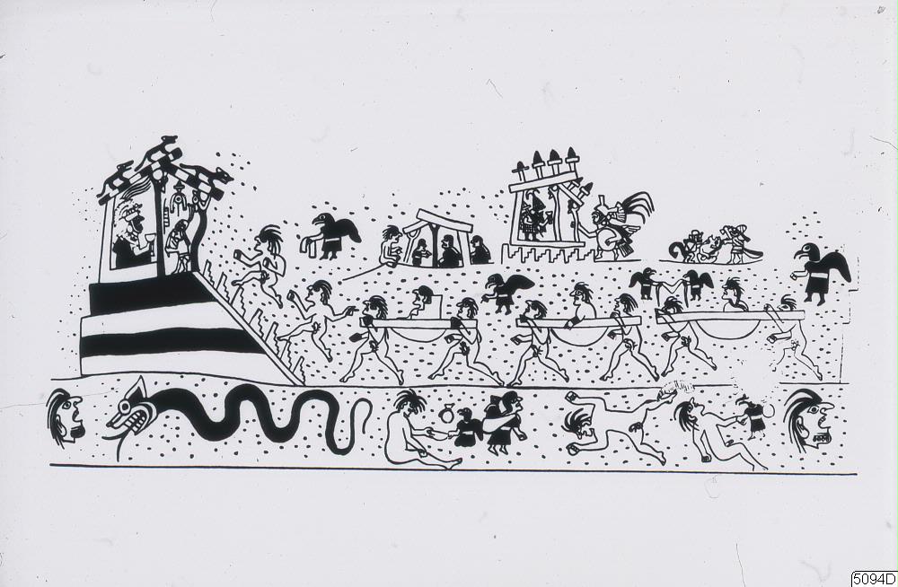 • Målad scen på arkeologiska lerkärl från norra Peru; fångar som åderlåtes, bärare av bärstolar som närmar sig en högreståndsperson sittande på en tron i en pyramidliknande byggnad. Avfotografering ur C... Visa hela