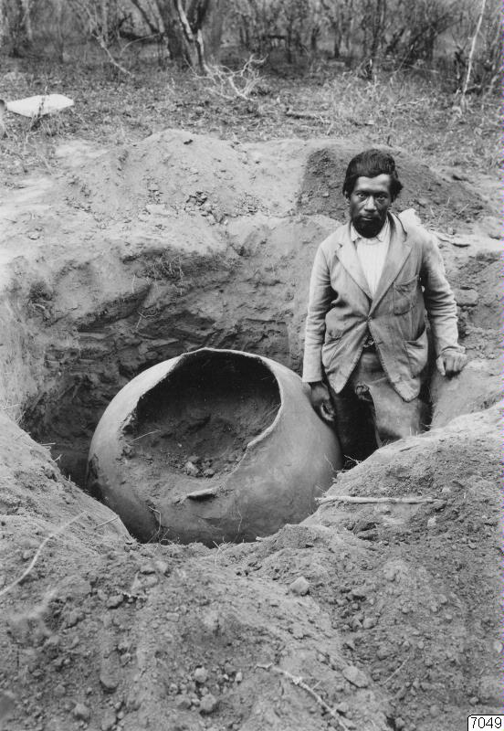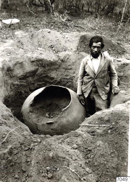 Los Yacimientos Arqueológicos en La Candelaria (Prov. Salta) Gran urna funeraria en "El Piquillinal" Contenido: l esqueleto de individuo adulto. No habia ajuar fúnebre. Encima de la boca de esta urna se hallaron varias piedras lajas y framgentos de otras piezas de alfareria. Excavación en Julio de 1930. R. S. Julio de 1930. (katalogkort)