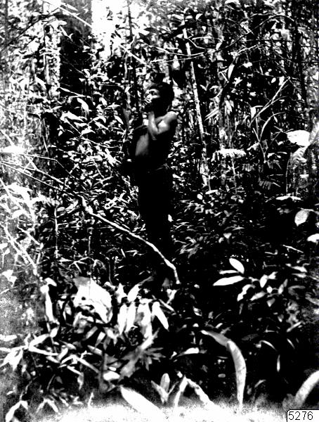 Arekunaindian lockar kolibrier i skogen. Han är beväpnad med blåsrör och koger. Öster om Roroima. Foto erhållit genom köp av fotografen 1915. (Katalogkort)