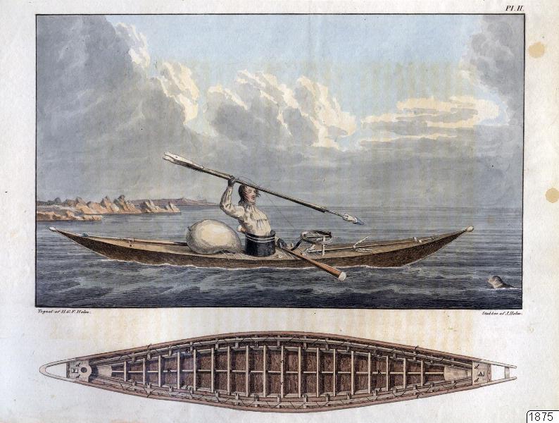 Motiv: Eskimå i kajak på säljakt. Laverad reckning, tryckt.