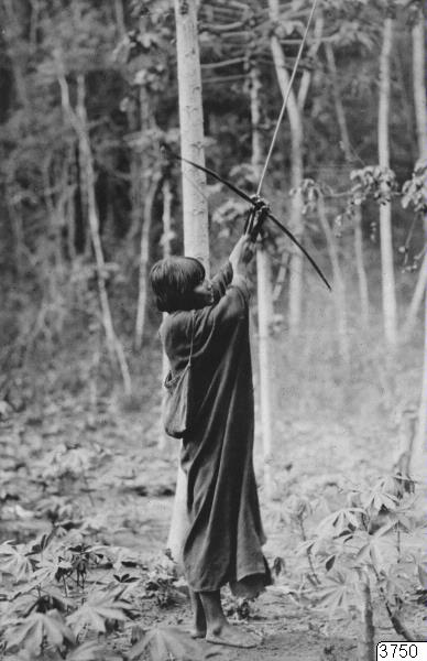 Nedre R. Pérene, Perú. Stam: Campa. Motiv: Ung man som bågskytt. Foto: G. M. Dyott. Dato: 1920. Erh av: Otto Nordenskjöld. Dato: 1924. Neg nr: 002010. Publ: Otto Nordenskjöld: Explorations chez etc. i Meddelandet från Geografiska Föreningen i Göteborg III, 1924 figur 22.