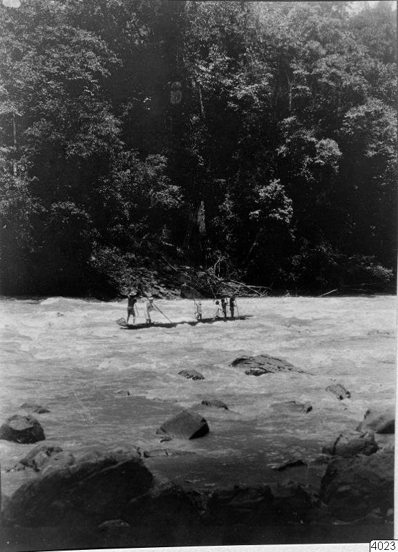 • Indianynglingar utför en fors i Baudófloden på flotte.