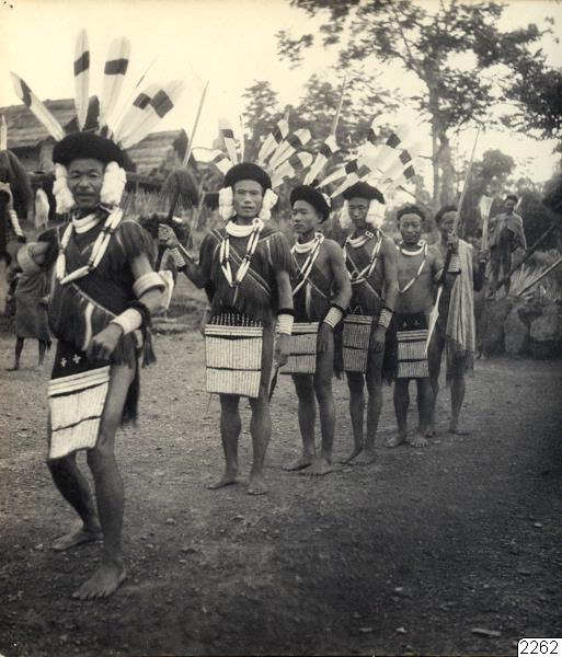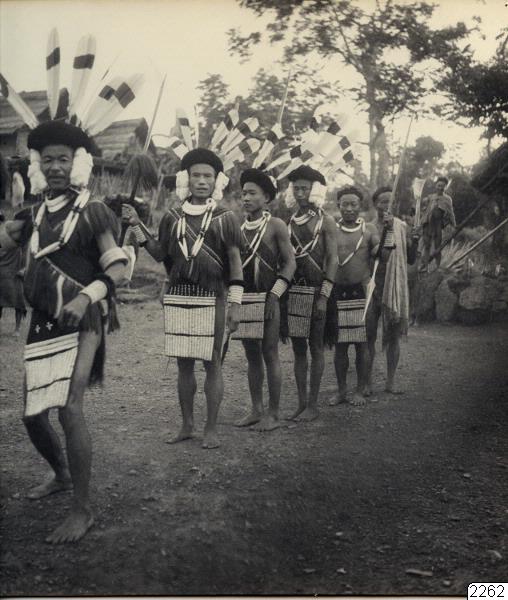 Mokokelung, Naga Hills, söder om Dikhufloden, Assam. Krigsdans. (Jfr. med text t. nästan identisk bild i Westerlunds bok v.s. 48: "Dansen går före jakten") Fotot erhållit som förstoring enligt Westerlunds Negativ till fotonummer 2261. Jfr. Per Westerlund: "Under den röda mantelns skydd", Stockholm 1939, bild vid sid. 48. (Katalogkort)
