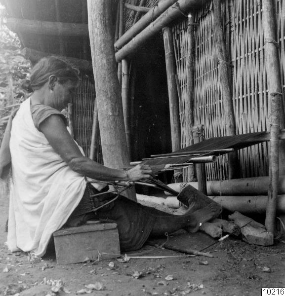 Motiv: Vävning av manteltyg. Lokal: Naga Hills, Söder om Dikhufloden, Assam. Stam: Sema-naga. Foto: Per Westerlund, sep. 1938. Erh. av dito, 1946. (katalogkort).