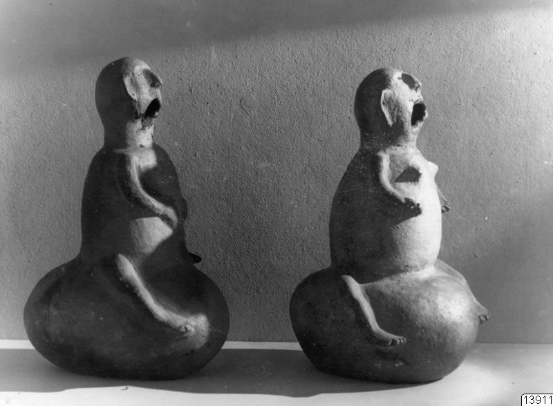 • Motiv: Två kärl i människoform. Av lergods. Höjd: f.v. 30,5 o. 31 cm. Samlade av H. Wassén 1934. GEM 33.14.95 o. 94.