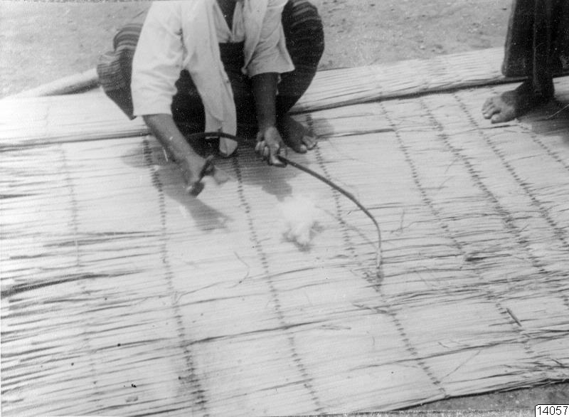 Motiv: Man med bomullsbåge. "Carding kapok on coast of Alor.". Mars 1939. Lokal: Indonesien: Alor. Foto av: Cora DuBois. Avfoto av O Brändström, maj 1956. (katalogkort)