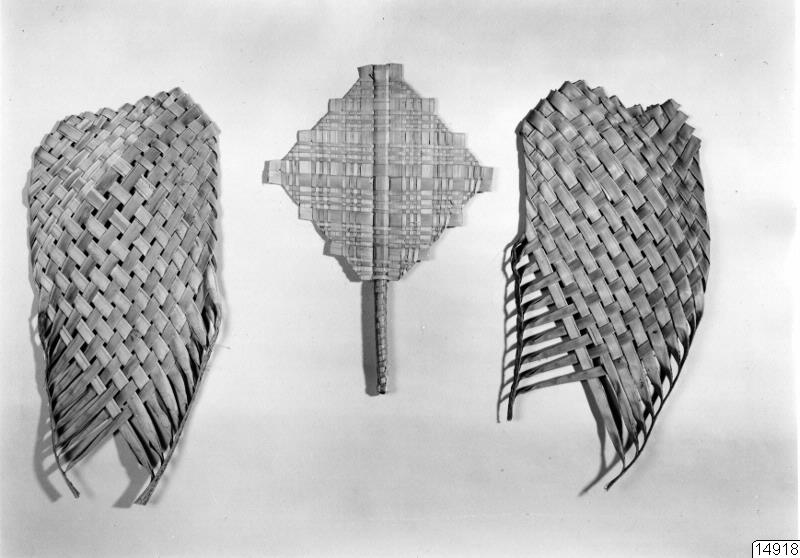 • Flätarbeten: (Överst:) (FR. v.:) GEM 59.21.92: måltavla i tupe-spelet; 21.94: fläkt, accessoar; 21.93: måltavla som ovan. H.: 47, 39 o. 47 cm. (katalogkort)