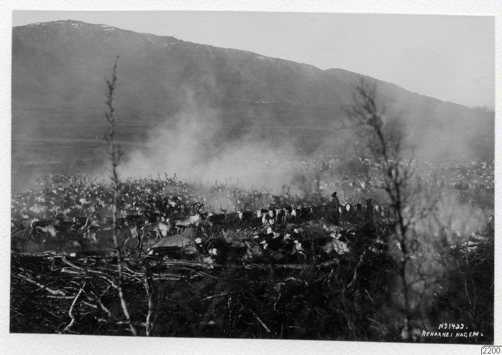 Renskiljning. Den vita röken är endast ånga från de hetsade djuren, bland vilka lapparna spanar efter de egna för att driva dem till särskilda inhägnader för märkning.