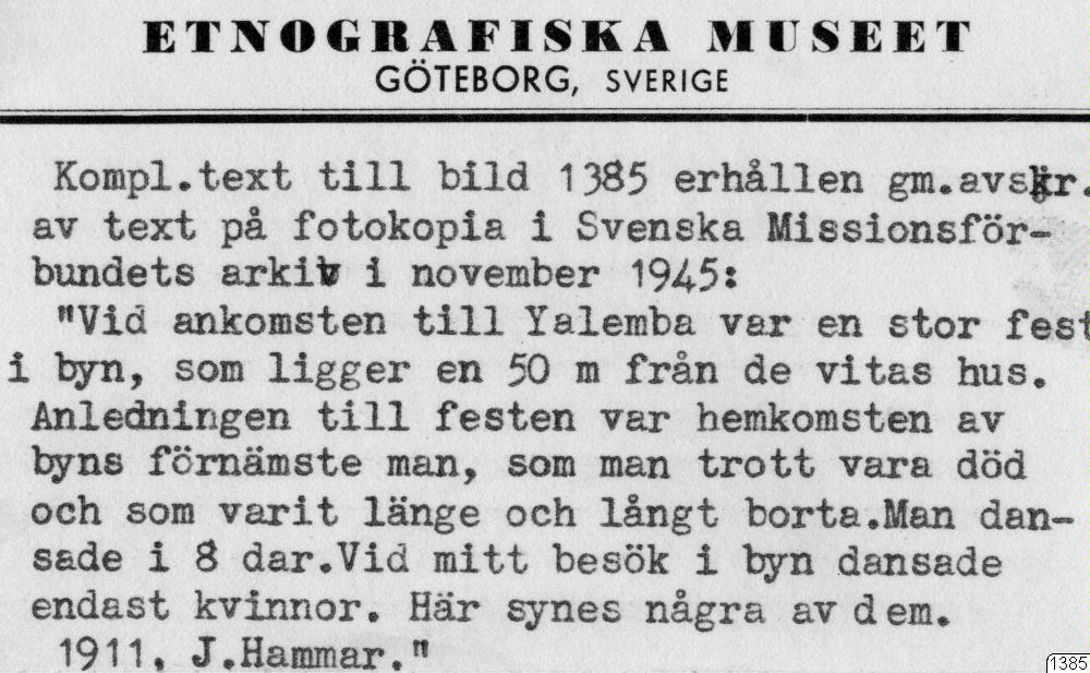 Motiv: Kvinnor färdiga till dans. Foto av: missionär J. Hammar Dato: 1911. Erh. av: köp av dito Dato: 1917. Lokal: Yalemba, (Belgiska Kongo) Zaire . (katalogkort) Text på enskilt papper från Etnografiska Museet, Göteborg, Sverige: Kompl.text till bild 1385 erhållen gm.avskr. av text på fotokopia i Svenska Missionsförbundets arkiv i november 1945: "Vid ankomsten till Yalemba var en stor fest i byn, som ligger en 50 m från de vitas hus. Anledningen till festen var hemkomsten av byns förnämste man, som man trott vara död och som varit länge och långt borta. Man dansade i 8 dar. Vid mitt besök i byn dansade endast kvinnor. Här synes några av dem. 1911, J. Hammar."
