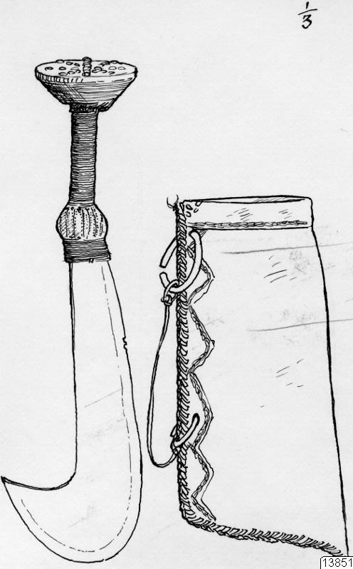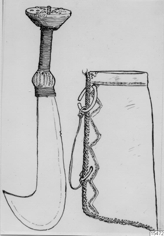 Motiv: Järnkniv med slida. Tillhör privatsamlaren Hr. Henning Filipsson, Brunnsgatan 26, Göteborg. Visade nov. 1955 för bestämning. Enligt brev av 21.1.56 från fil. dr. Efraim Andersson (till Wassén) liknar den böjda kniven starkt en "couteau d'armes" från Alima, dep. Alima, alltså trakten av Alima-floden. Den är möjligen från "någon av de mera nordliga stammarna: bayanzi, babangi, bambochi eller bakuyu". Lokal: Zaire/Belgiska Kongo (?), se motivtext. Stam: /se motivtext/. Teckning av O. Puusta. Dato: nov. 1955. Nr. Neg: 008334-8336. (katalogkort)