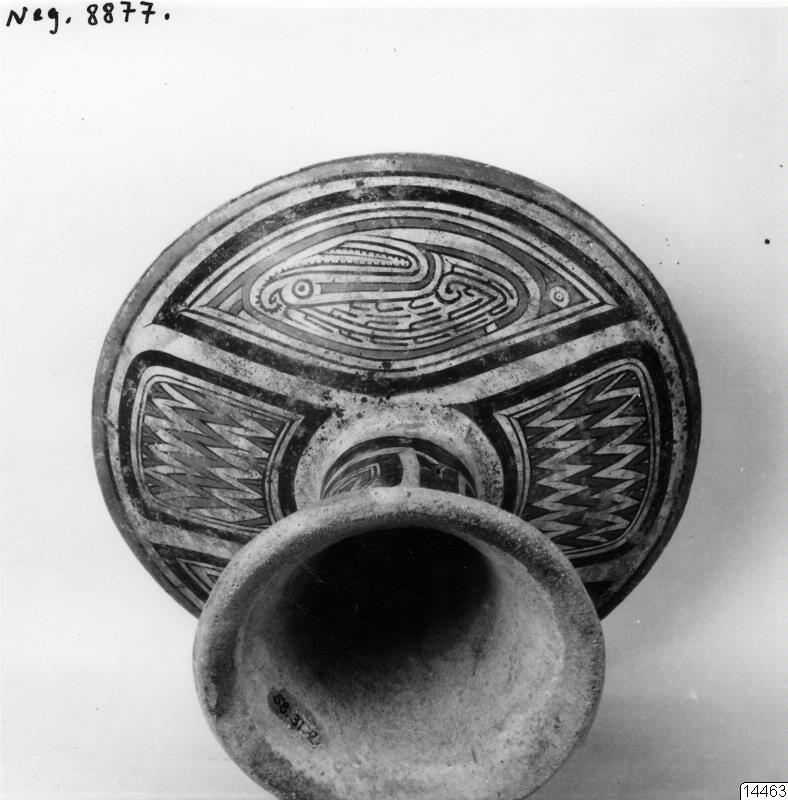 Motiv: Två fotos (undersida och detaljbild) av polikroma lerkärlet 58.31.2. Jämför bildnr. 14451 med ren profilbild av samma kärl (neg. 8845). Lokal: La Peña, V. till NV. om Santaiago de Veraguas, Panama. Stam: /arkeologi/ Foto av: Olof Brändström. Dato: aug. 1959. Erh.: till arkivet. Dato: 31.8.1959. Nr. Neg.: 8877-8878. Publ. fig. 9 i Henry Wassén: "A Find of Coclé-Style Pottery" etc. (Årstryck...
