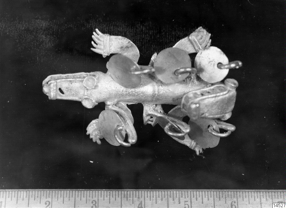 • Motiv: "Krokodilgud" med två huvuden. Guldföremål, 114 gram. Anträffat av Sr. Julio López.