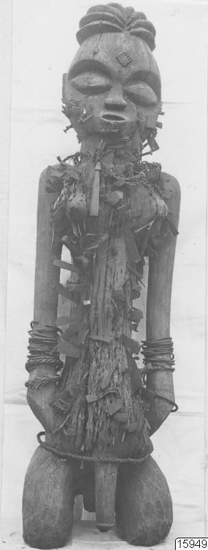 Motiv: Mpindi-fetisch från Mayombe, 125 cm hög. Se Bildarkiv, kat.nr. 015948 (S). Mpindifetischen sedd framifrån, naken. Stam: Bayombe-Basundi. Lokal: Mayombe, Nedre Kongo, f.d. Belgiska Kongo. Afrika. Foto: av J. Hammar, Värnamo. Erh.: Katalogisering och utställning.