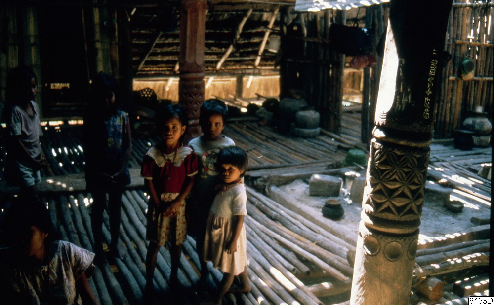 Restaurering av tak hos interrimsrajan i Memboro. Barn, mellanvåning med vackert snidade stolpar, till höger syns köket, en kokplats i sand. Lokal: Memboro, västra Sumba