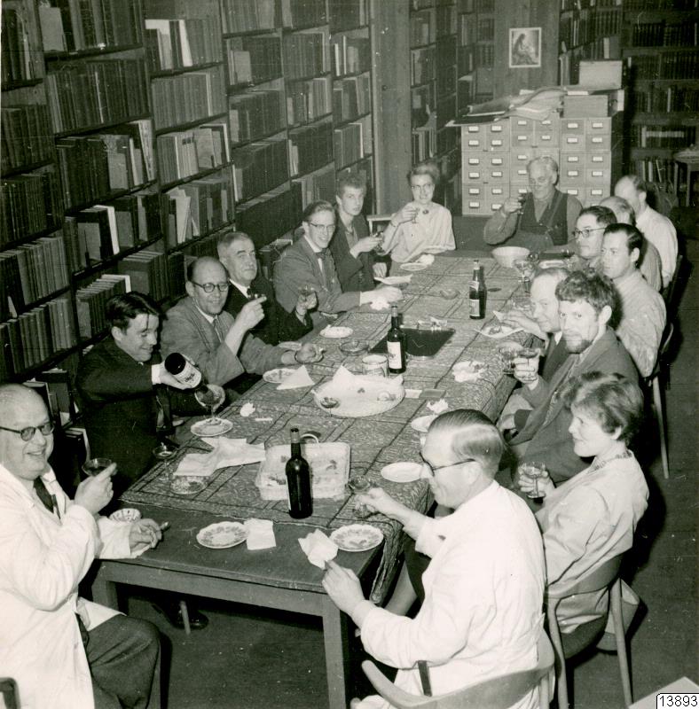 Party i Etnografiska museets bibliotek vid avslutning av utställningsarbeten i salarna för Sydamerikas etnografi, Indonesien, Söderhavet och Afrika. Även tillfälligt anställd hjälpkrafter deltog. Vi drack sherry och knaprade på ostpinnar mm. Vid kortändan närmast kameran i vit rock och glasögon: Izikowitz och Wassén. Möjligen E. Palmers i glasögon vid andra kortänden.