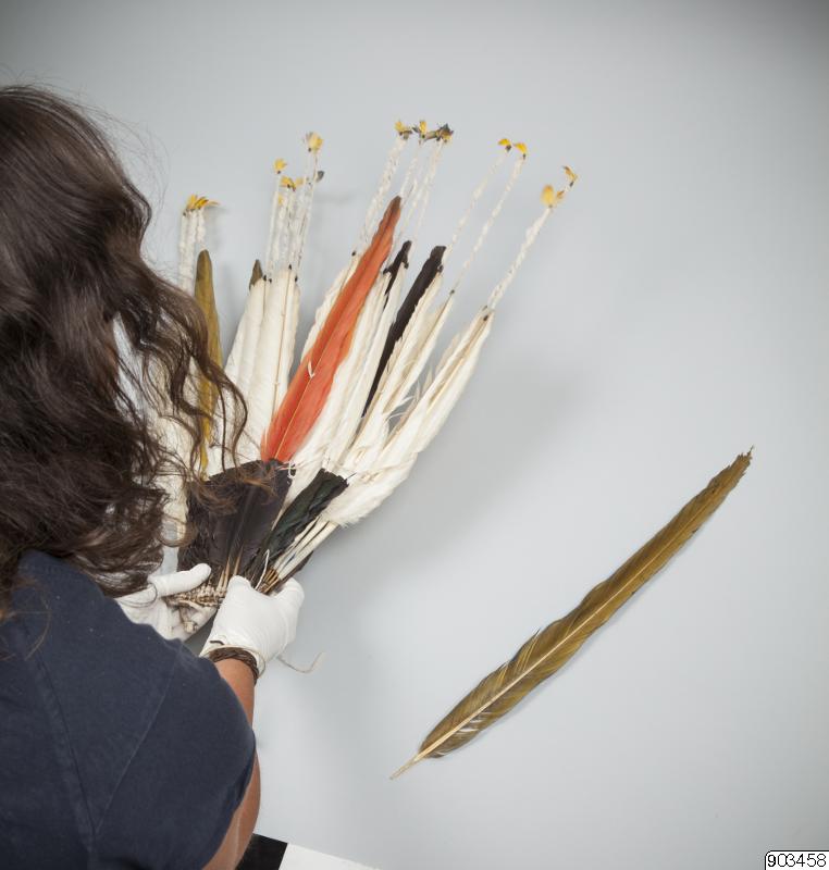 • Textilkonservator Anna Javér förbereder fjäderföremål som ska fotograferas till utställningen Feathers