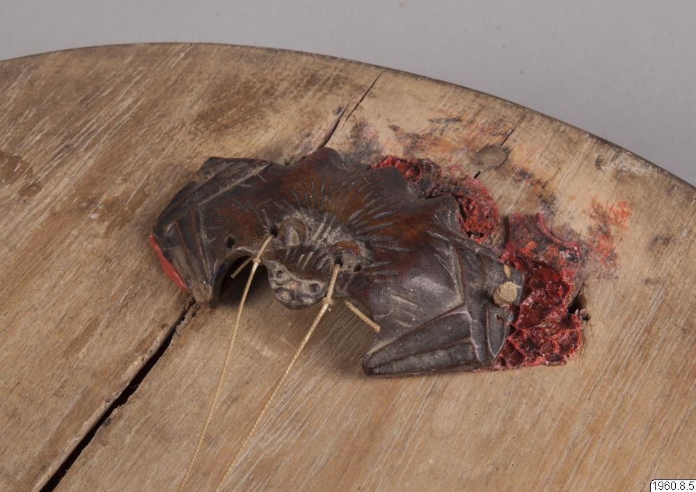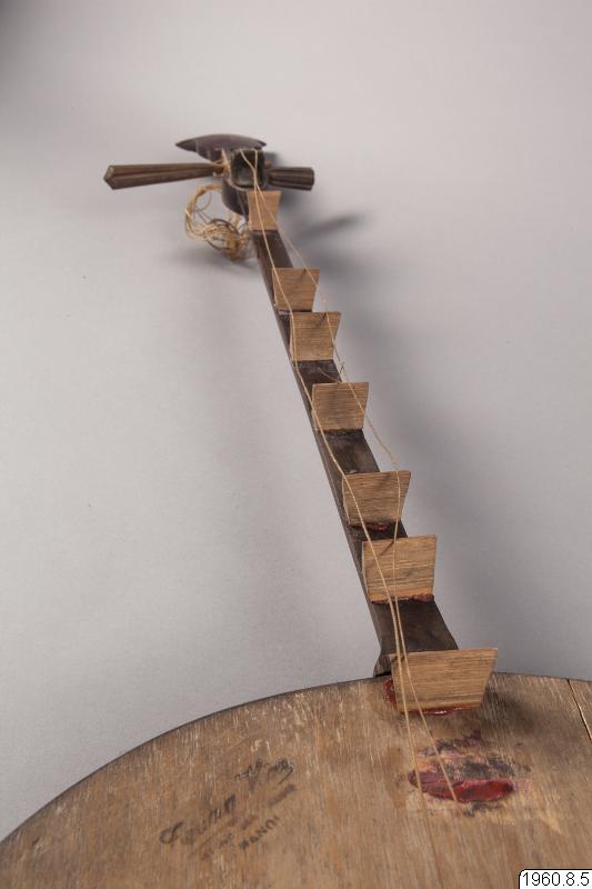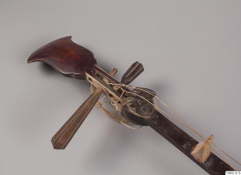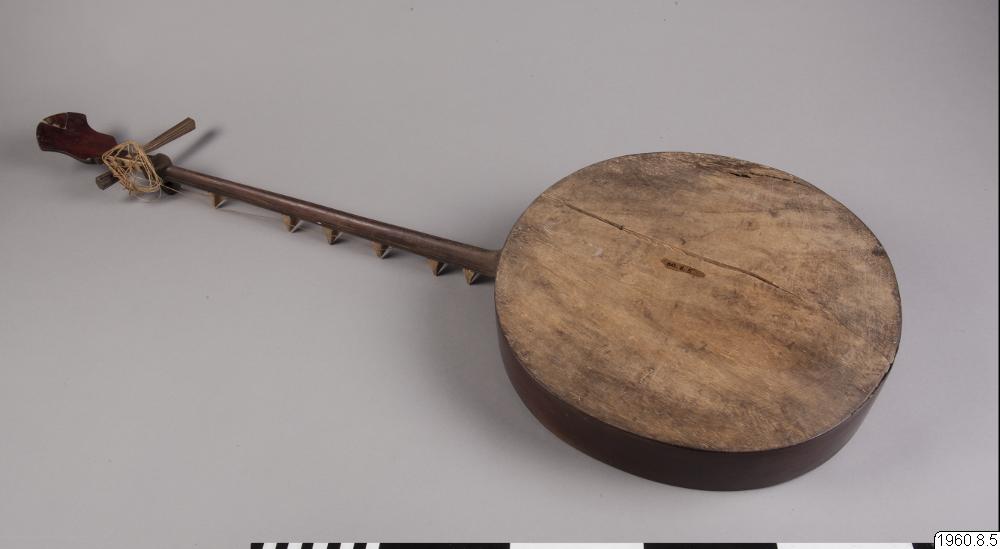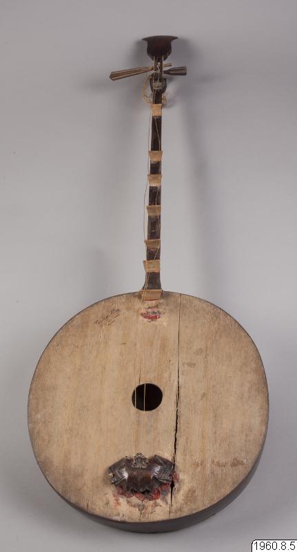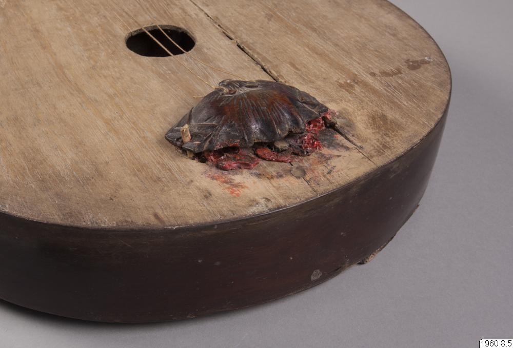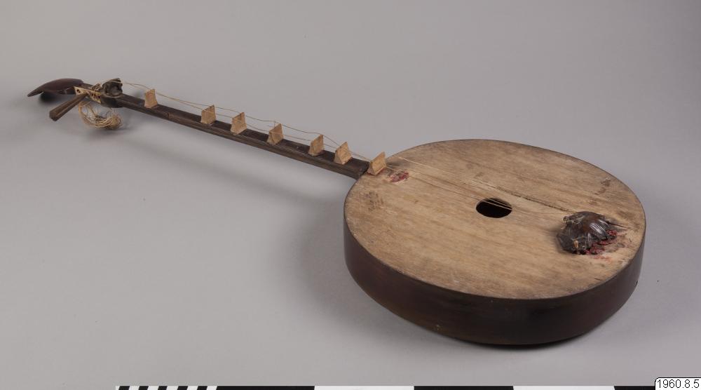 Guitarr, i defekt skick. Längd: 101 cm. Av samma typ som den kinesiska mångitarren (ye-kin) har den troligen haft två dubbla strängar. På detta exemplar finns endast två sidoställda (olika långa) skruvar. Strängfästet på locket har formen av en fladdermus, lyckans symbol. Kallas i Nord-Viêt-Nam:dàn nguyêt, i Syd-Viêt-Nam: dòn kiêm.