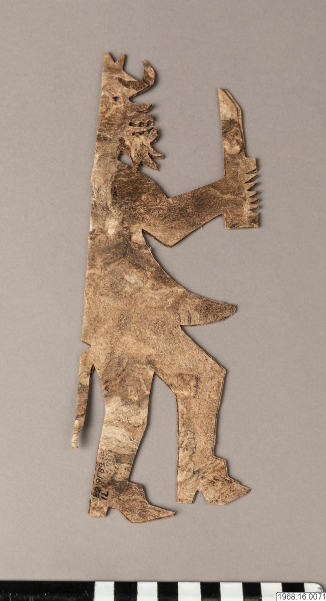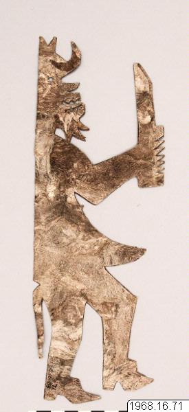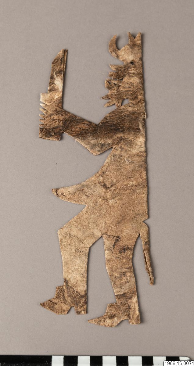 • Ur generalkatalogen: Silhuettfigur i amatepapper. Användes för trolldomssyften. Mått: 26,5 cm. Se nr 1968.16.0057. Enligt insamlaren föreställer föremålet "Señor de Diablo".