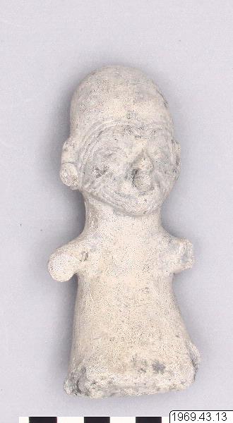Ur generalkatalogen: Människofigur i keramik från så kallad Tumaco-kultur. Ansiktet är dekorerat med bland annat tre streck på vardera kinden samt en näsprydnad. Ben saknas och figuren har två små utskjutningar föreställande armar, varav den ena är skadad. Höjd: 11 cm. Största bredd: 5,5 cm. Jämför med nr 1947.25.0001 och 1955.27.0001 där också litteraturhänvisningar finns angivna.Stäng