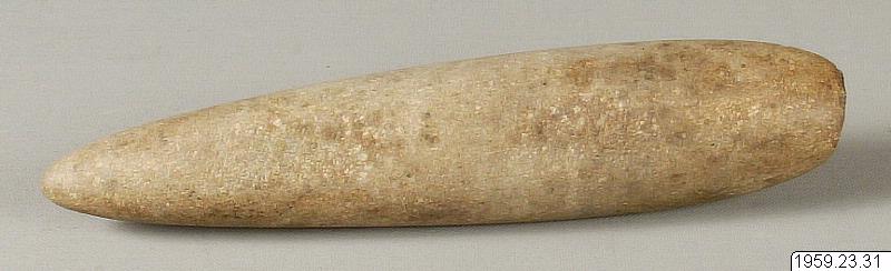 Tväryxblad av sten. Bladet är av en ljusgrå stenart och är slipat. Spetsig nacke med nästan cirkulär sektion. Längre fram har bladet en konvex-konvex sektion med den ena sidan nästan plan och med böjda korta sidpartier, medan den andra är kupig. Längd: 23,5 cm Originalnr. I 5975. Insamlat av Axel Bojsen-Möller under dennes resa 1955-56.