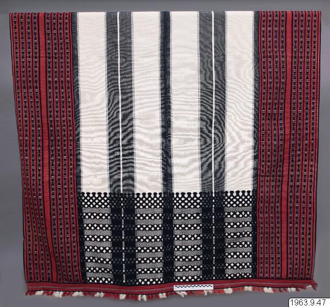Filt av bomull. Fyra långsmala vävnadsstycken - de två mittersta bredare - har sytts samman. I kortändarna har man sytt fast en smalare bård. De två yttersta längsgående vävnadsstyckena har sin mönstring i varpen: i rött, indigoblått och vitt, de mittersta i indigoblått och vitt har både varp - och inslagsmönstring. Kortändarnas bårder mönstrade i rött och indigoblått samt med tofsar i rött och vitt. Hela filtens storlek: 260 cm * 165 cm. Filtar av detta slag användes vid förnämt folks begravning. Den döde kan ligga på en sådan filt. Kallas dinli.qan pinagpagan qan binunne.