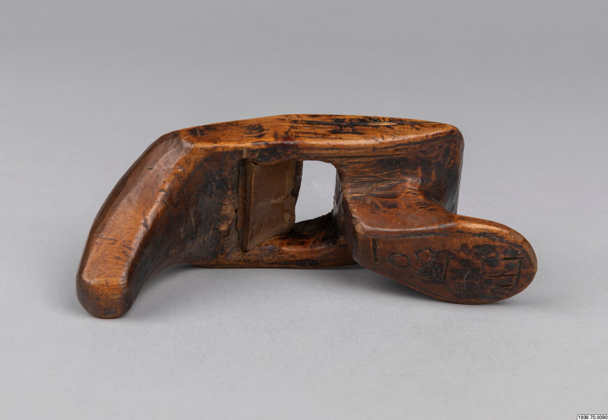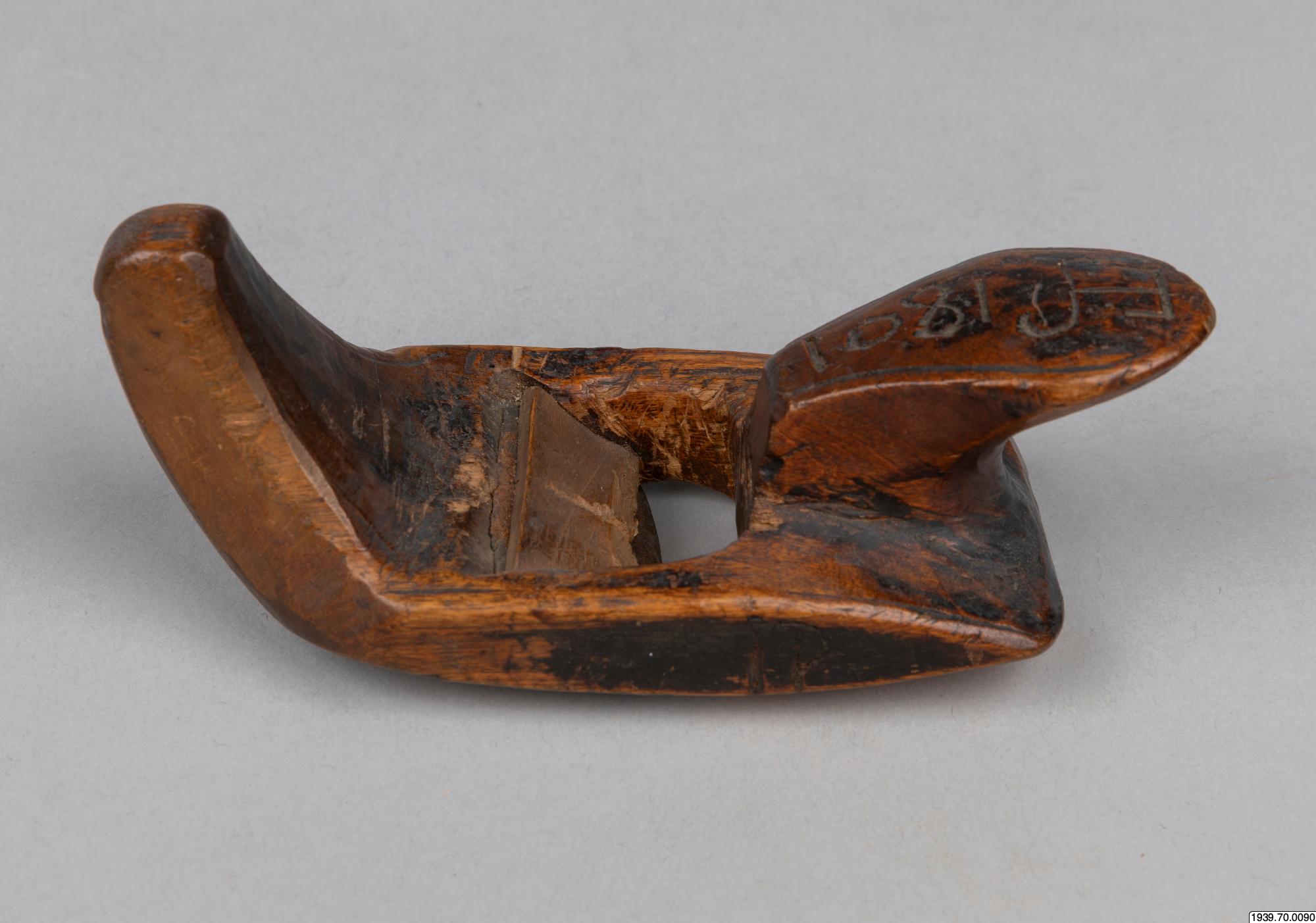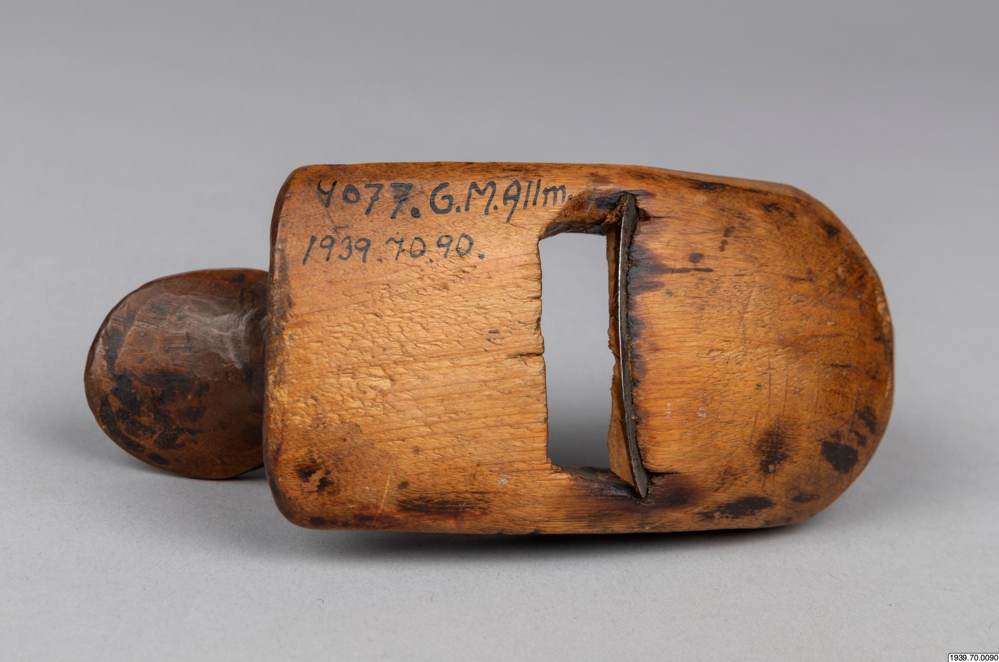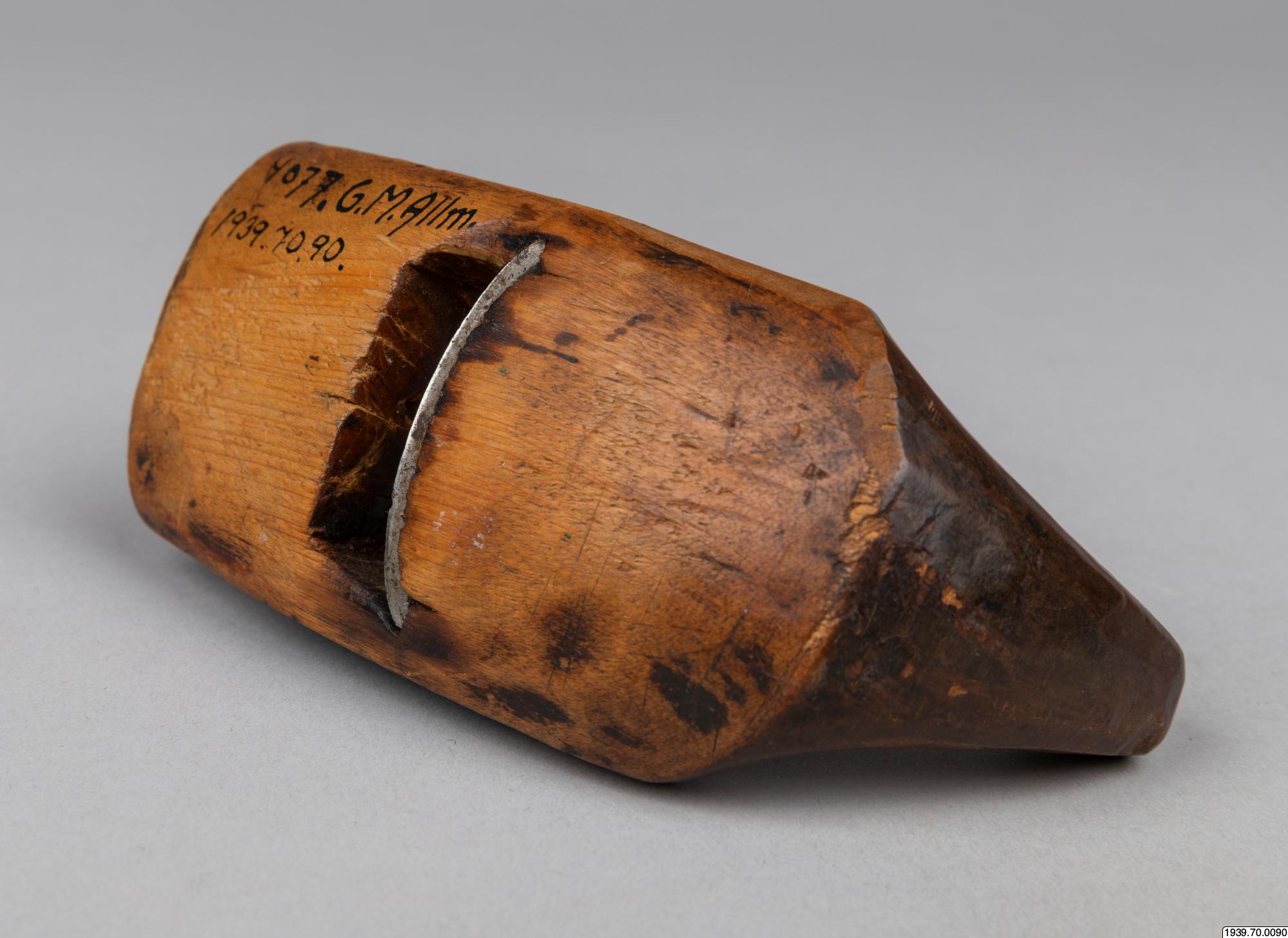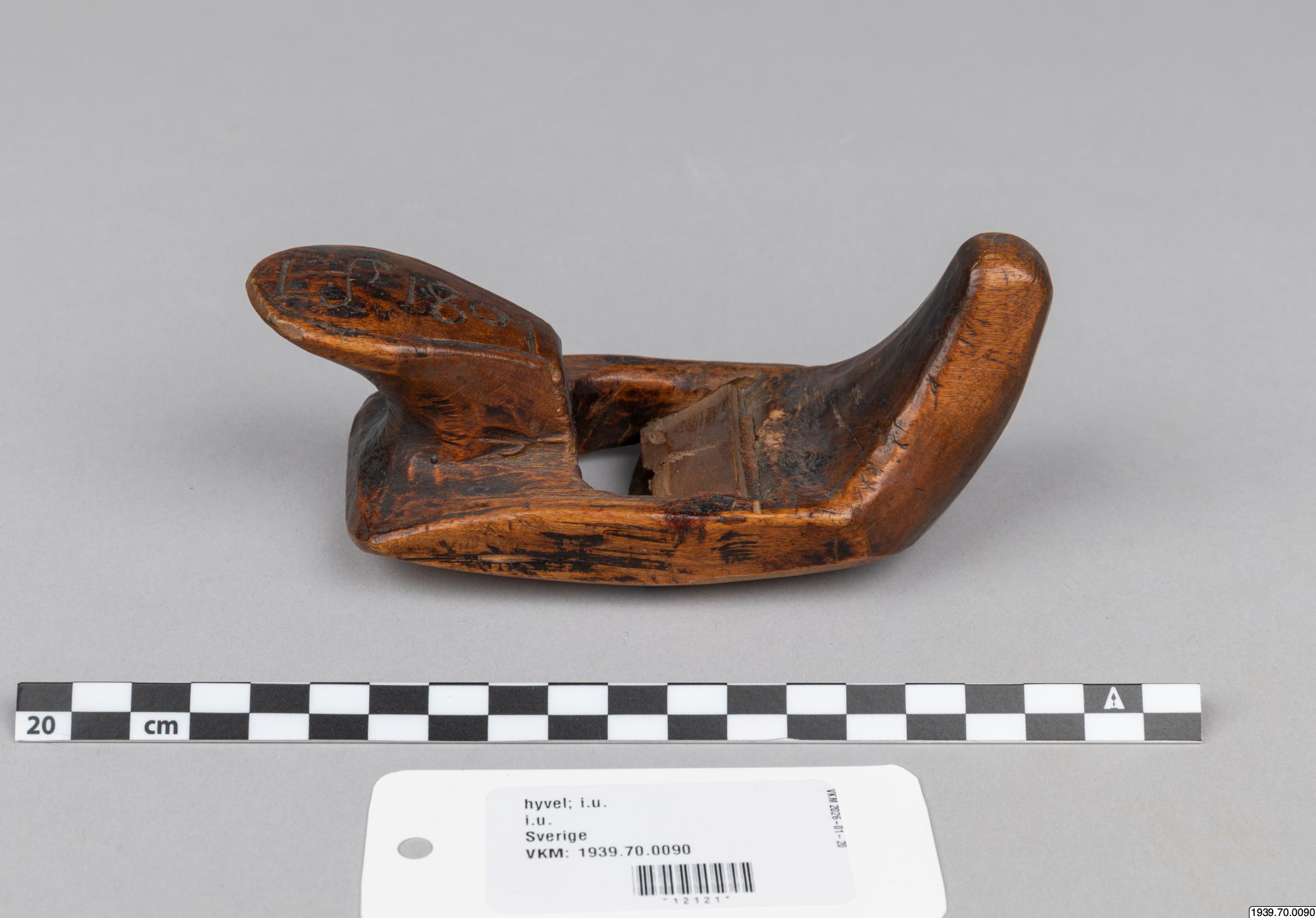 En lapphyvel, användes till att hyvla akjor och skidor med. Har tillhört en akjemakare i Stalofjället. Saml. Ernst Persson. (4077). Köpt av läraren vid Skyttenska skolan i Tärna, Herr Pettersson