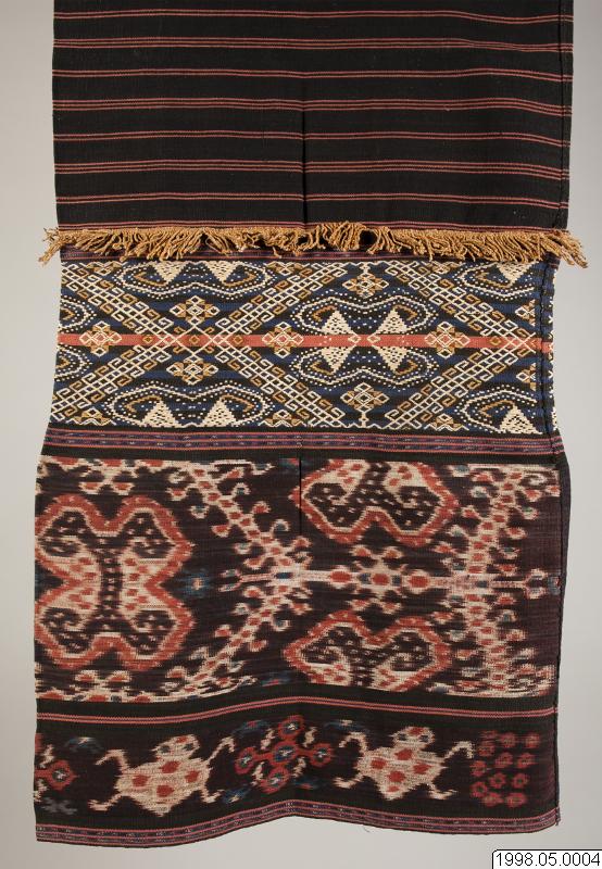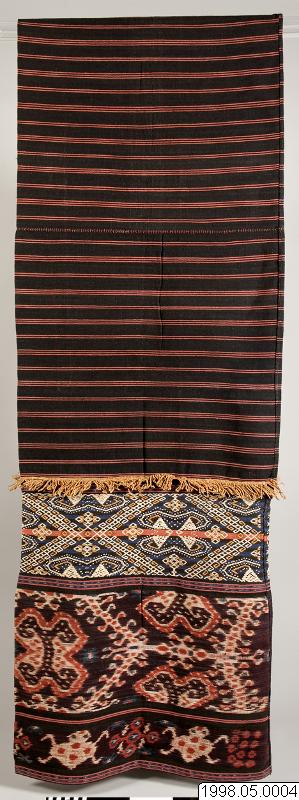 Lau pahudu, randig varpripsmönstrad sarong dekorerad med, pote, tvinnade fransar som sytts fast i tyget. Vävnaden är mönstrad i pahudu teknik och varpikat. Kombinationen vittnar om väverskans skicklighet och pahudun bärs av adliga kvinnor. Bården utmed den ikatmönstrade ytterkanten är dekorerad med sköldpaddor, mittenmotiven i de båda bredare bårderna (ikat och pahudu) föreställer en ofta förekommande korall som omges av patola ratu. Pahudu är den mest komplicerade av alla vävtekniker på Sumba och praktiseras sällan i Indonesien eftersom den är svår att bemästra i en ryggbandsvävstol. Svårigheten består i att under vävprocessen framkalla rätt kombination av de extra varptrådar som ska bilda mönstret och att få rätt sträckning och justering på dessa oberoende av grundväven. Väverskan förbereder de olika inslagen genom att på förhand plocka upp trådarna som ska skapa mönster över tunna bambustickor. Mellan varje plockmönsterinslag vävs ett eller flera tuskafsinslag som binder varpen. Tekniken vävs ofta i kombination med varpikat. Handspunnet växtfärgat garn med barken från Morindaträdet (morinda citrifolia) och indigo (indigofera sumatriana). Många växter ger gula, gulbruna eller gulgröna färgtoner och garnet till den enkla tuftade fransen kan vara färgad med den art som fanns närmast till hands eventuellt, kunyit-gurkmeja som används i byn. Köpt av Tamu Rambu Anamotor Priyawang i byn Rindi på östra Sumba 1998. se bild 6498, 6499, 9500, 6501,6502, 6503 och 6627