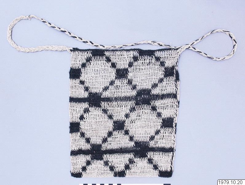 Fiskeväska av caraguatáväv. Sp. llica, m. hilú. jfr. 1979.10.0033. Mönster: sp. pata de carancho (caracarafågelns fot), m. ahutsajjus. (variacón 5) Mått: H:30 cm. Längd; övre(öl):25 cm, nedre(nl):23,5 cm