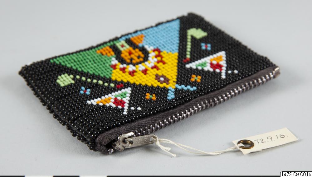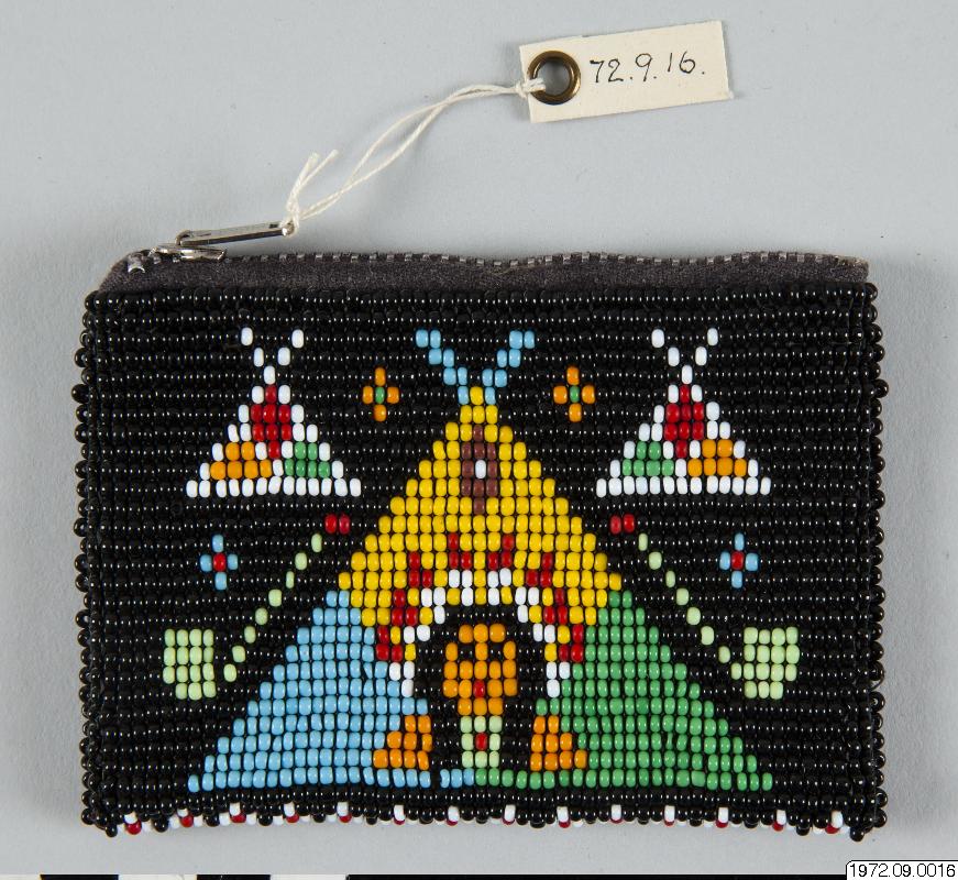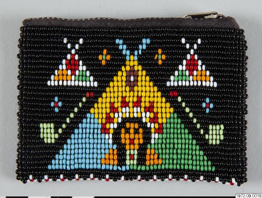 10,5 cm lång börs med mönster av olikfärgade glaspärlor, Mönter bildar dels ett indianhuvud i en wigwam eller tipi, dels några pipor. Börsen har lås av typ dragkjedja. Insaml. och Gåva av: fru Hedvig Torhillen erh. 1972.