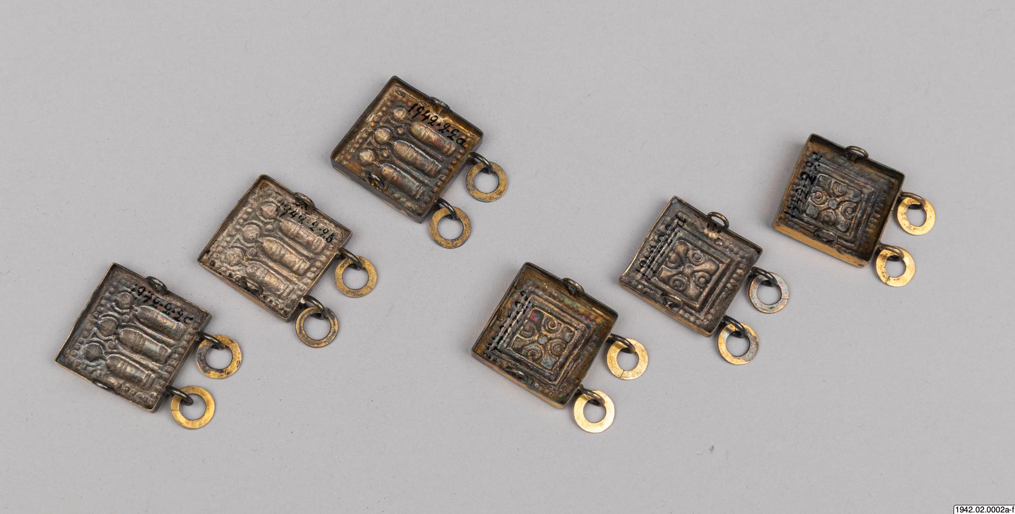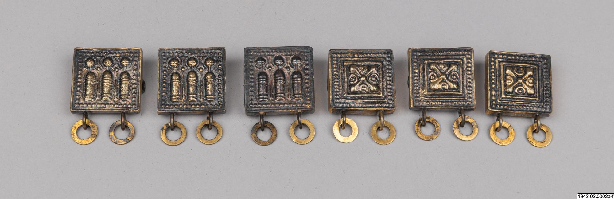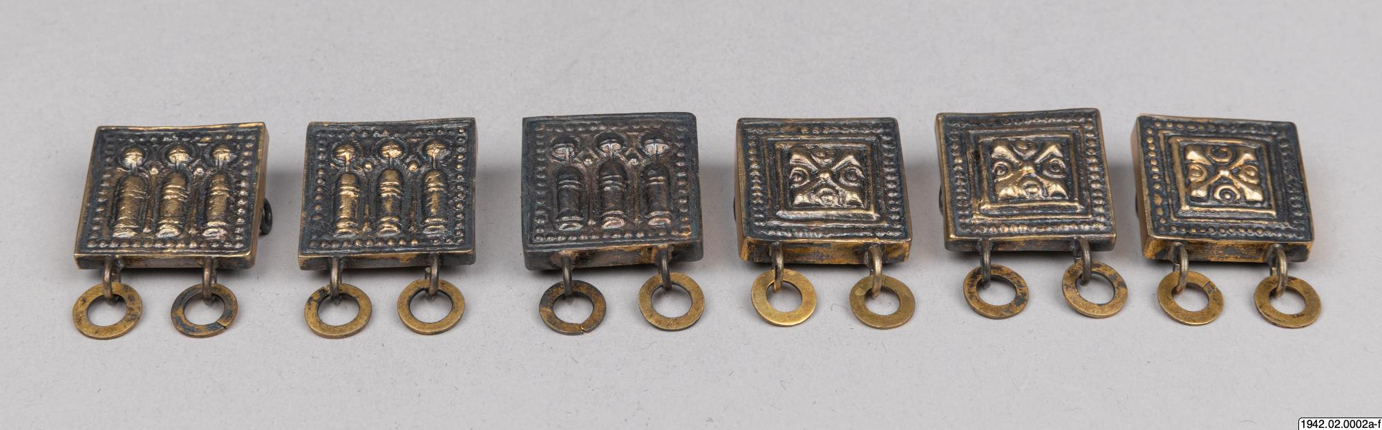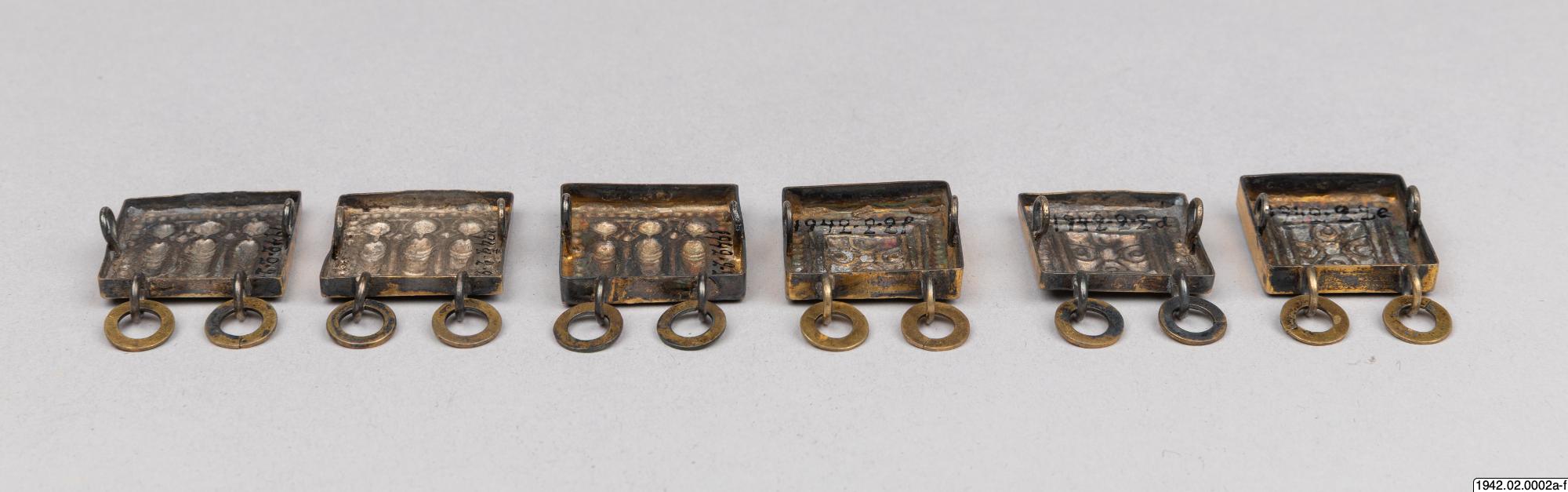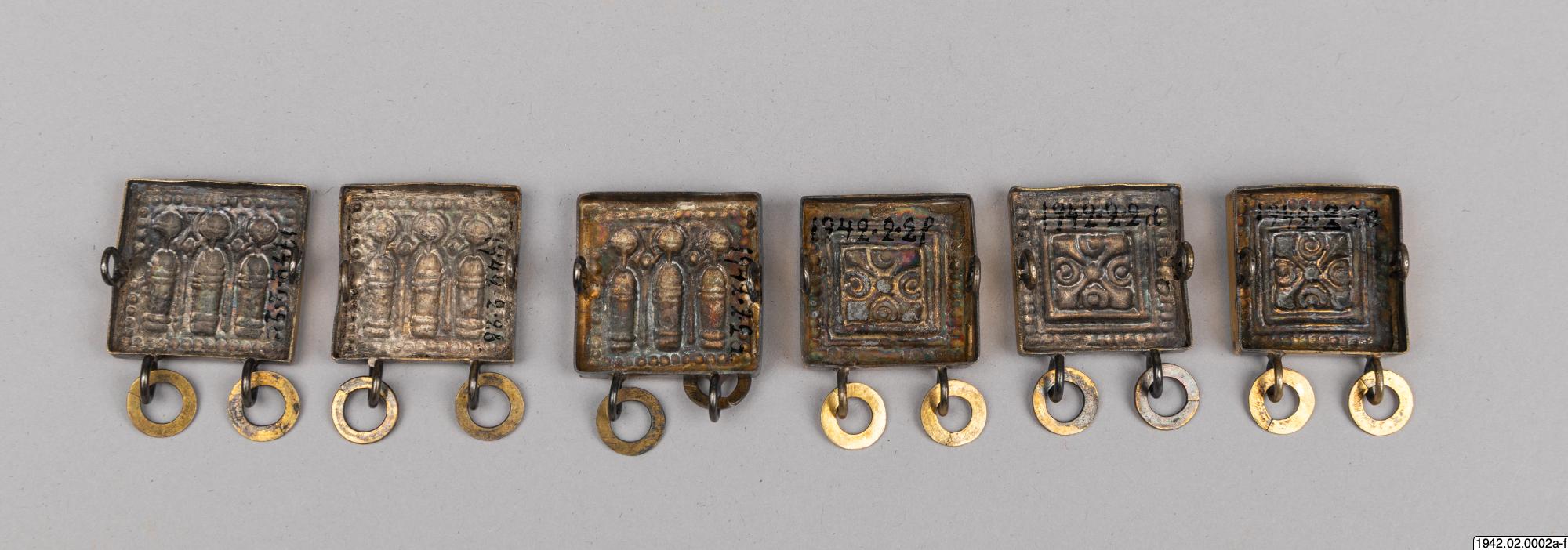 Smycke till silverkrage resp. bälte: 1939.56.0013, 1939.70.0129, 1939.70.0364, 1939.73.0001 (silverkrage), 1941.05.0001, 1942.02.0001, 1942.02.0002.