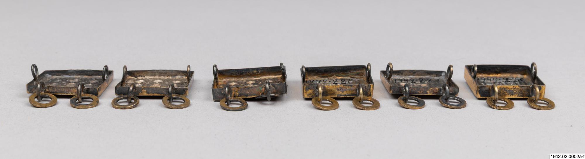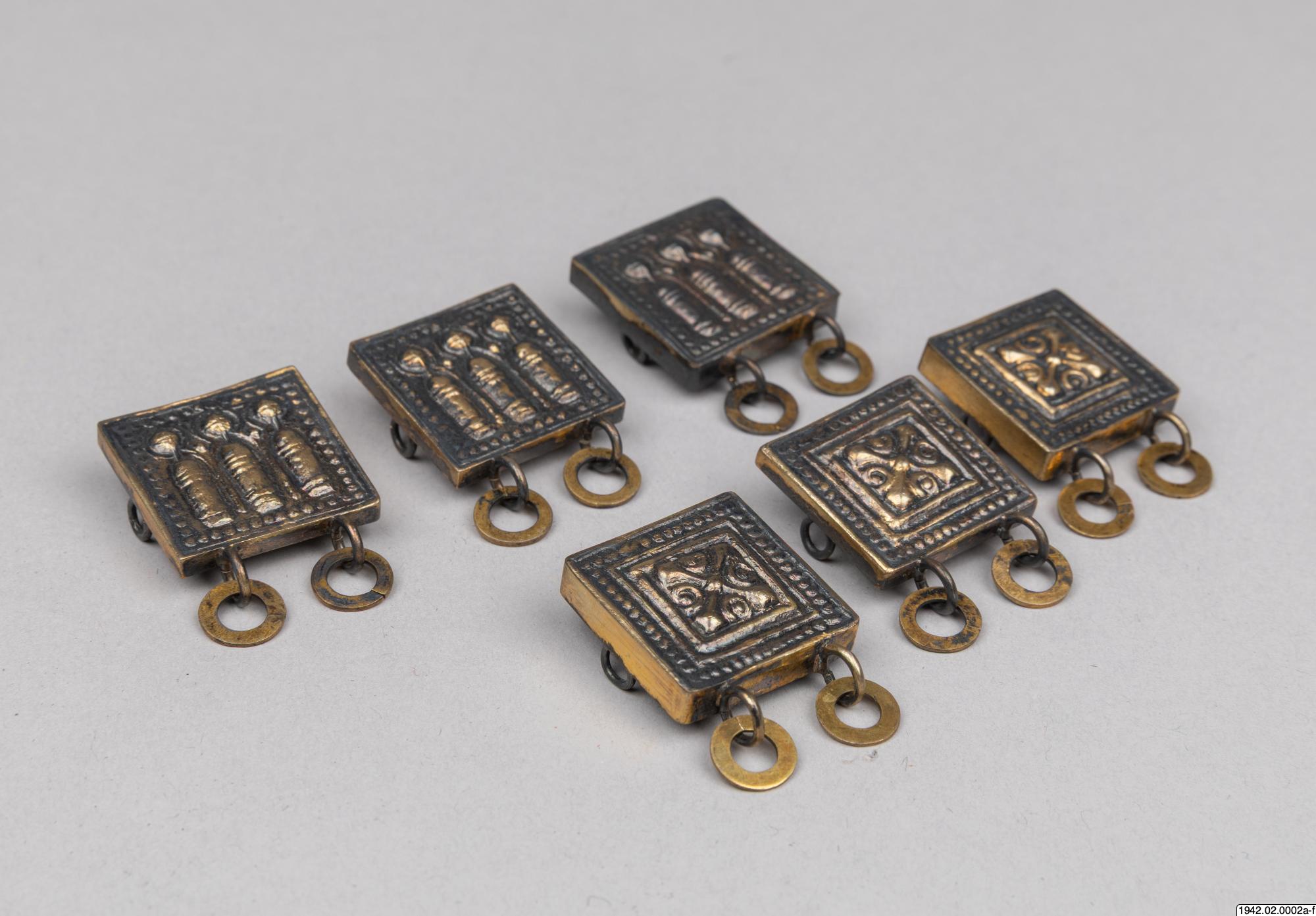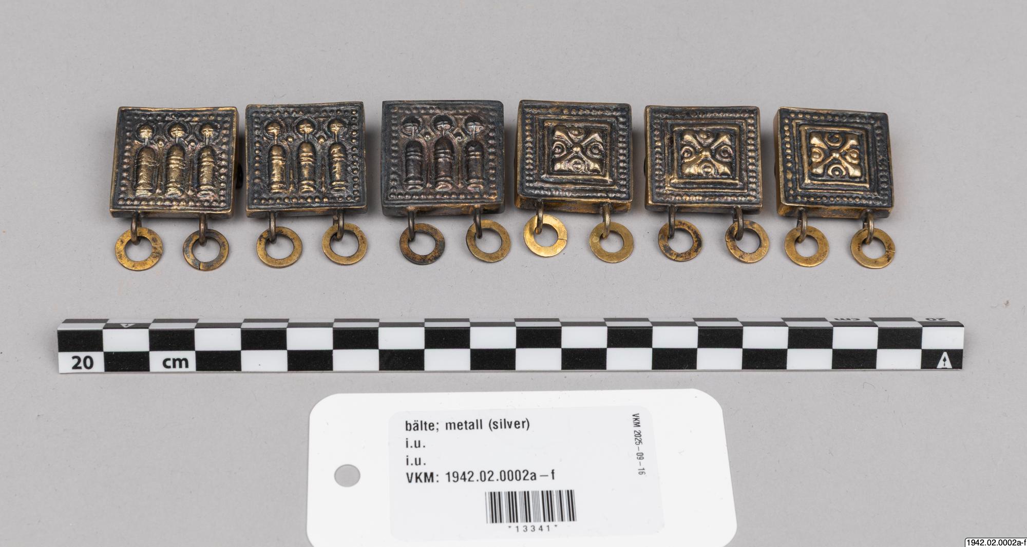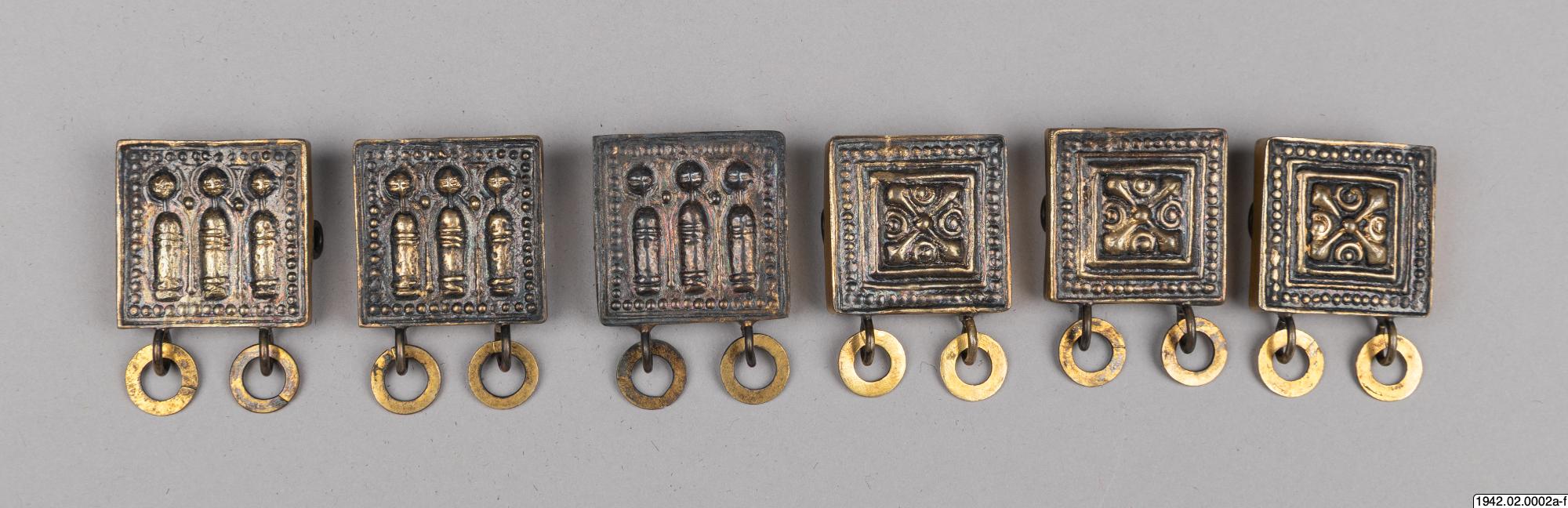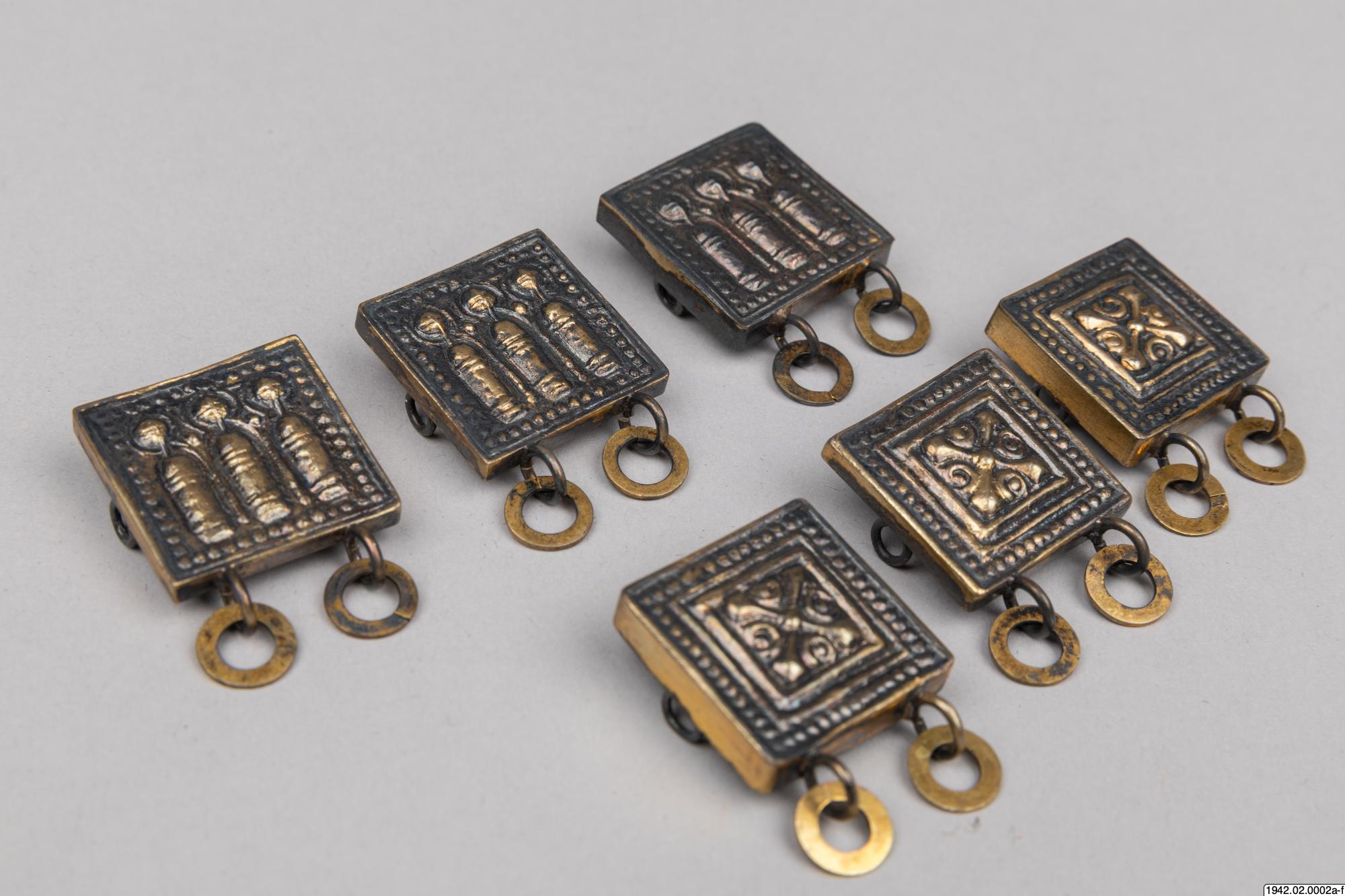 Smycke till silverkrage resp. bälte: 1939.56.0013, 1939.70.0129, 1939.70.0364, 1939.73.0001 (silverkrage), 1941.05.0001, 1942.02.0001, 1942.02.0002.
