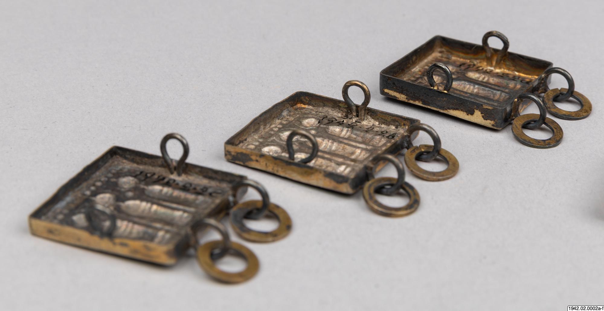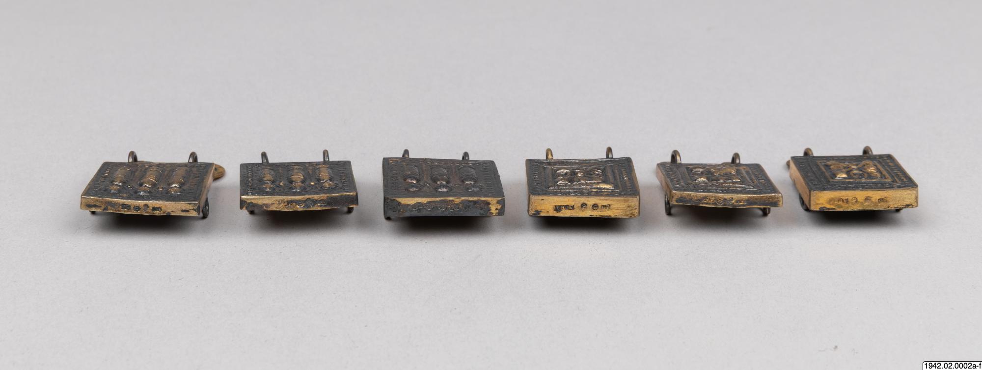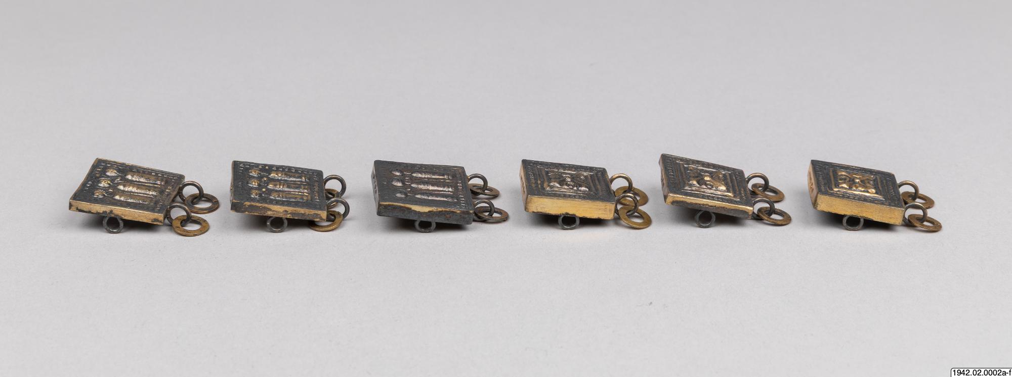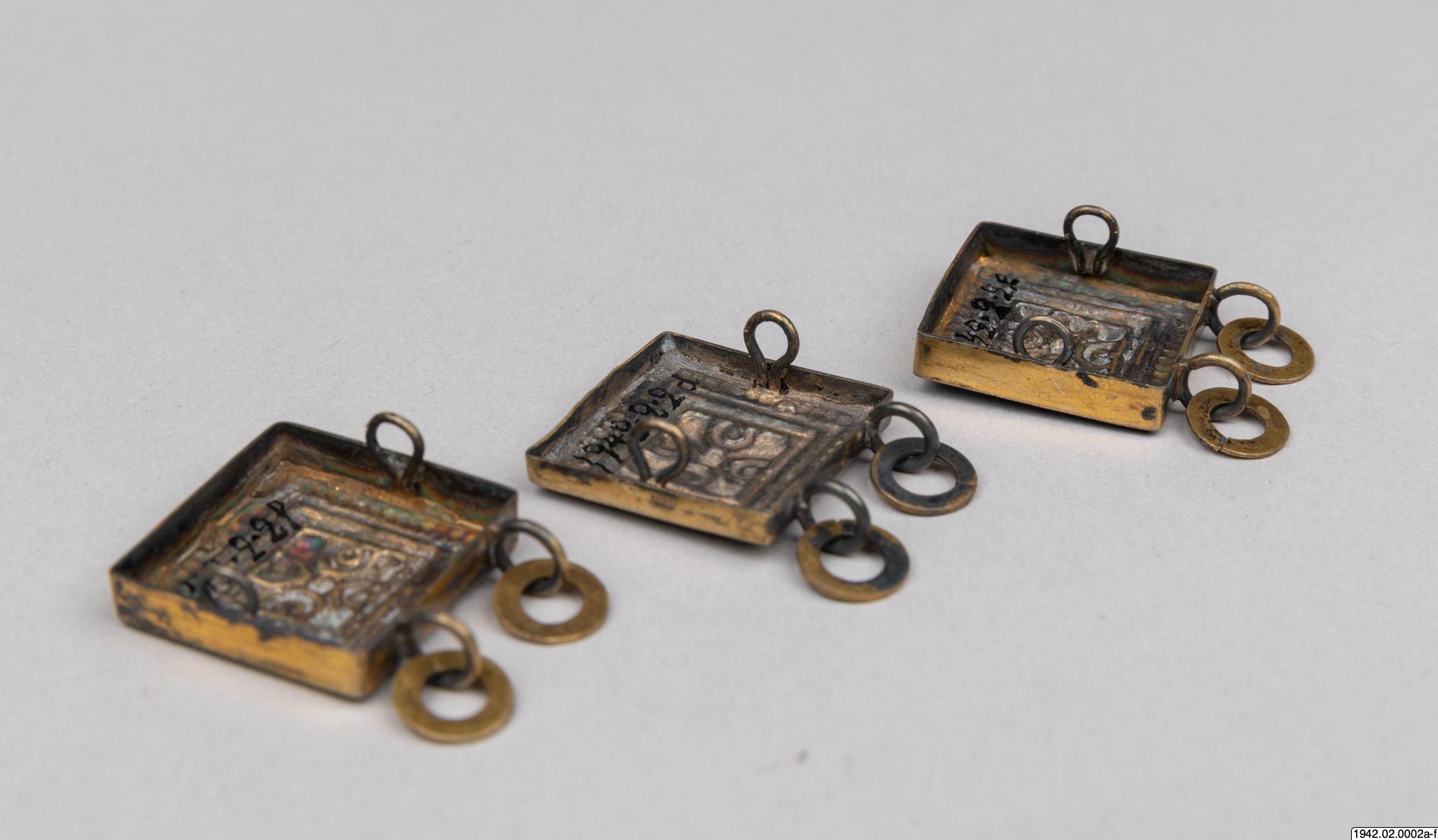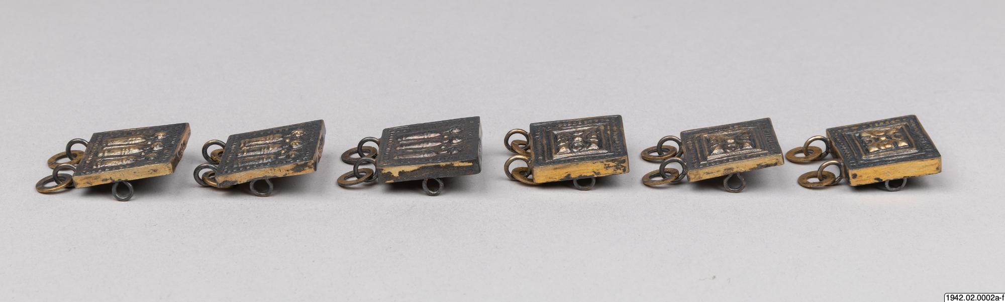 Smycke till silverkrage resp. bälte: 1939.56.0013, 1939.70.0129, 1939.70.0364, 1939.73.0001 (silverkrage), 1941.05.0001, 1942.02.0001, 1942.02.0002.