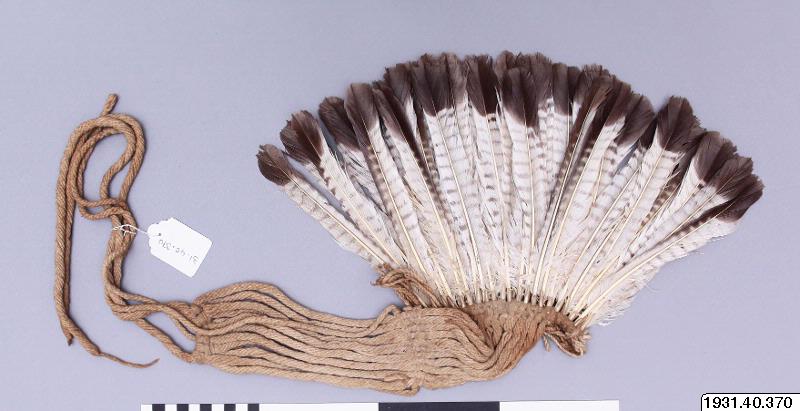 Det här är en nackprydnad gjord av stjärtfjädrarna från en falk. Nackprydnaden kommer från Apinayé i Brasilien. Falken vet man inte var den kom ifrån.