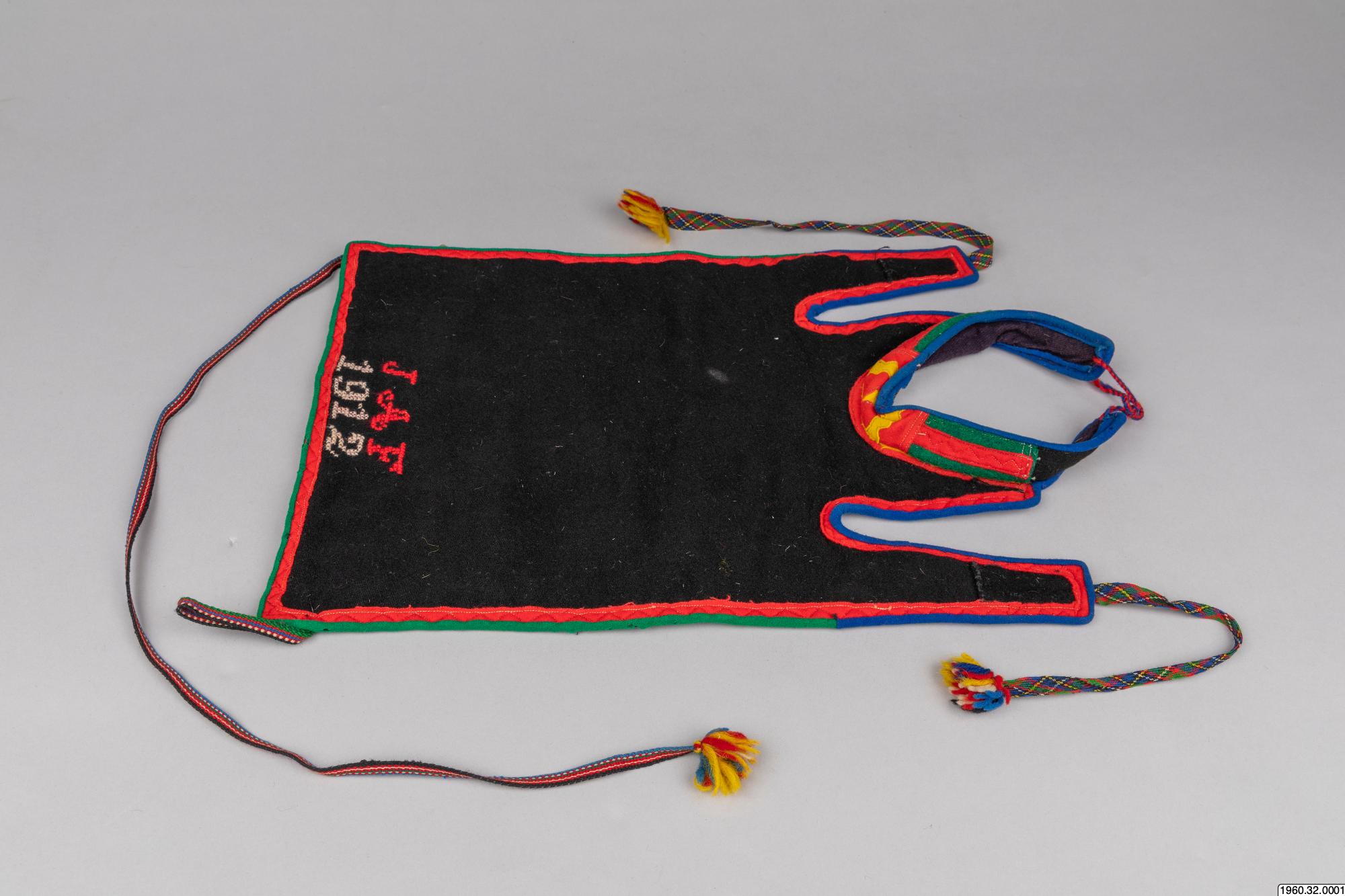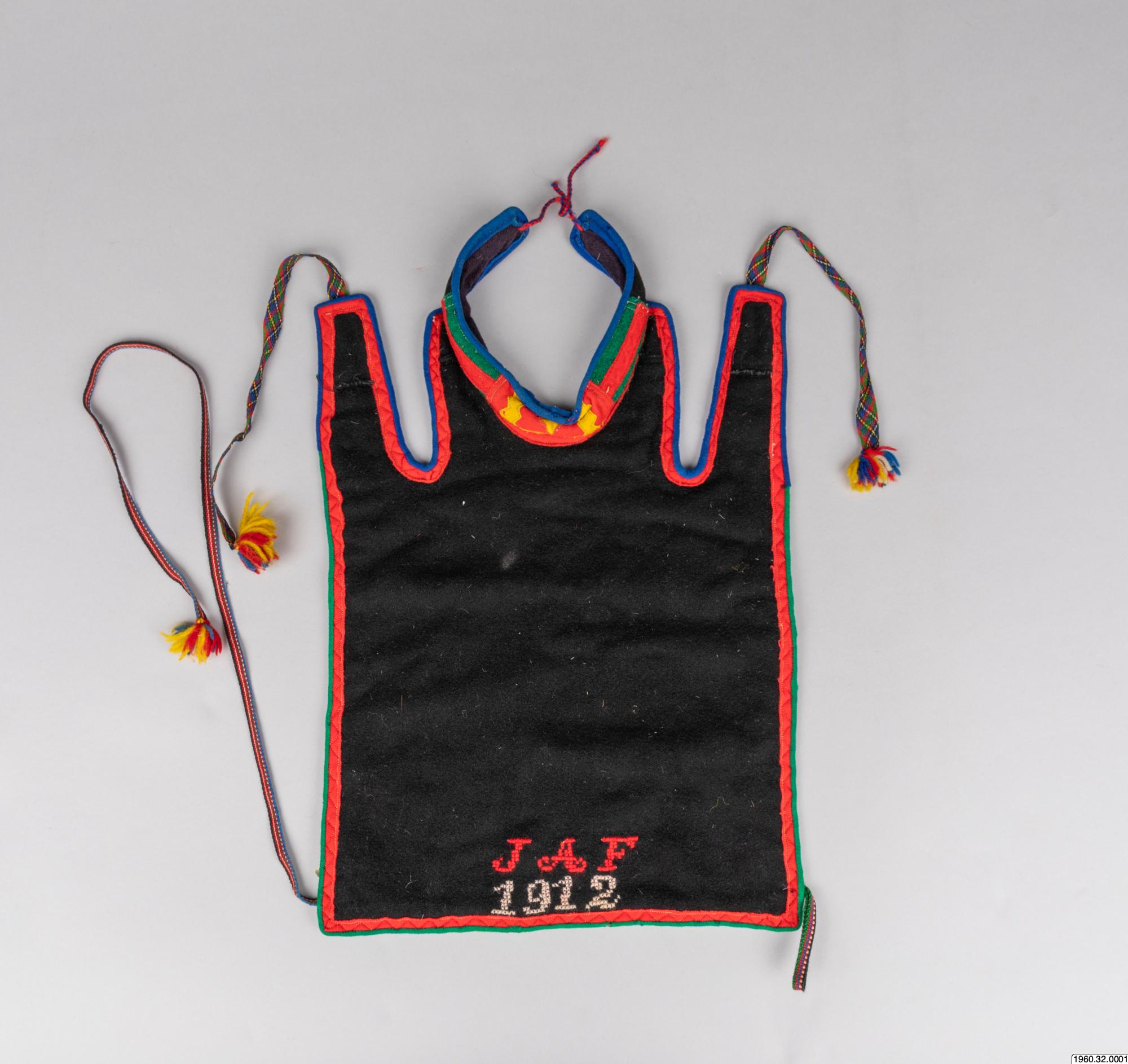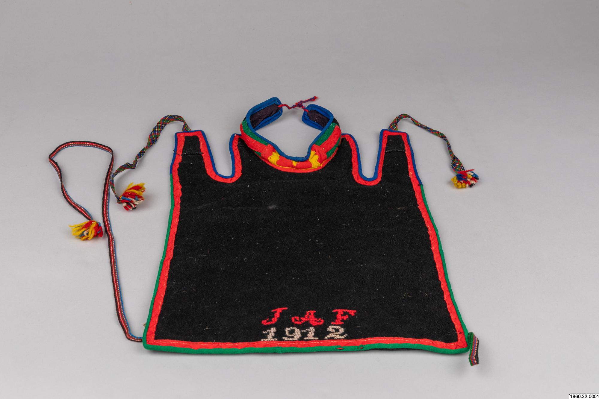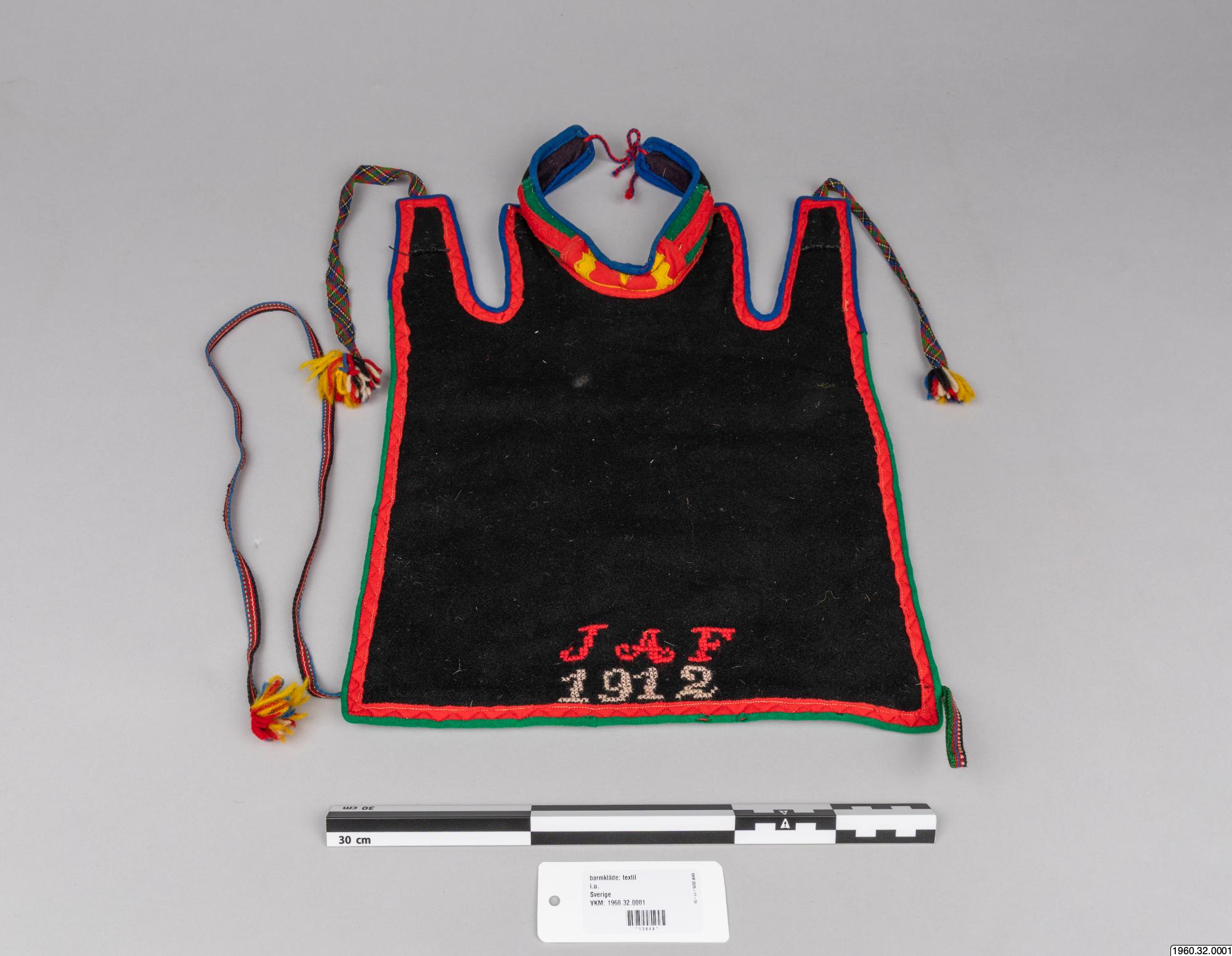 Barmkläde, vars framsida består ett svart vadmalsstycke. På baksidan fodrat med ett mörkblått tygstycke närmast av halvyllekaraktär. I kanterna och vid halslinningen bårder av rött, grönt, blått och gult tyg, vid halslinningen i applikationsteknik. Längst ner på framsidan korsstygnsbroderi i rött och vitt garn: initialerna "JAF" och "1912". Försett med band och snoddar för fastsättning. Banden ha...