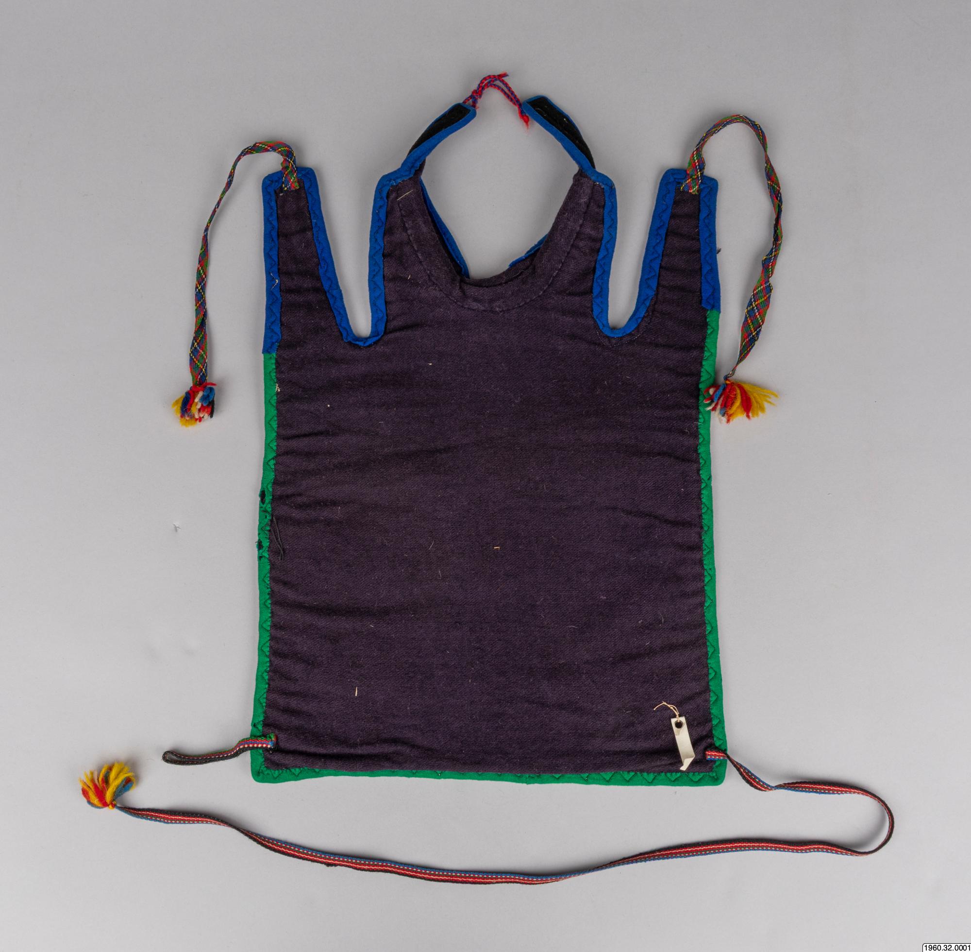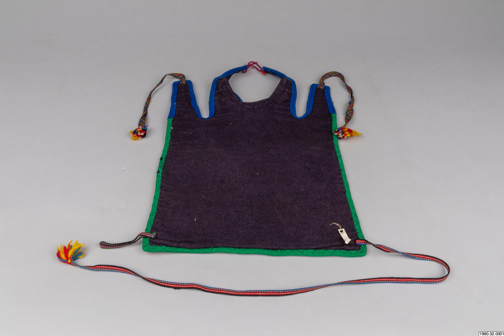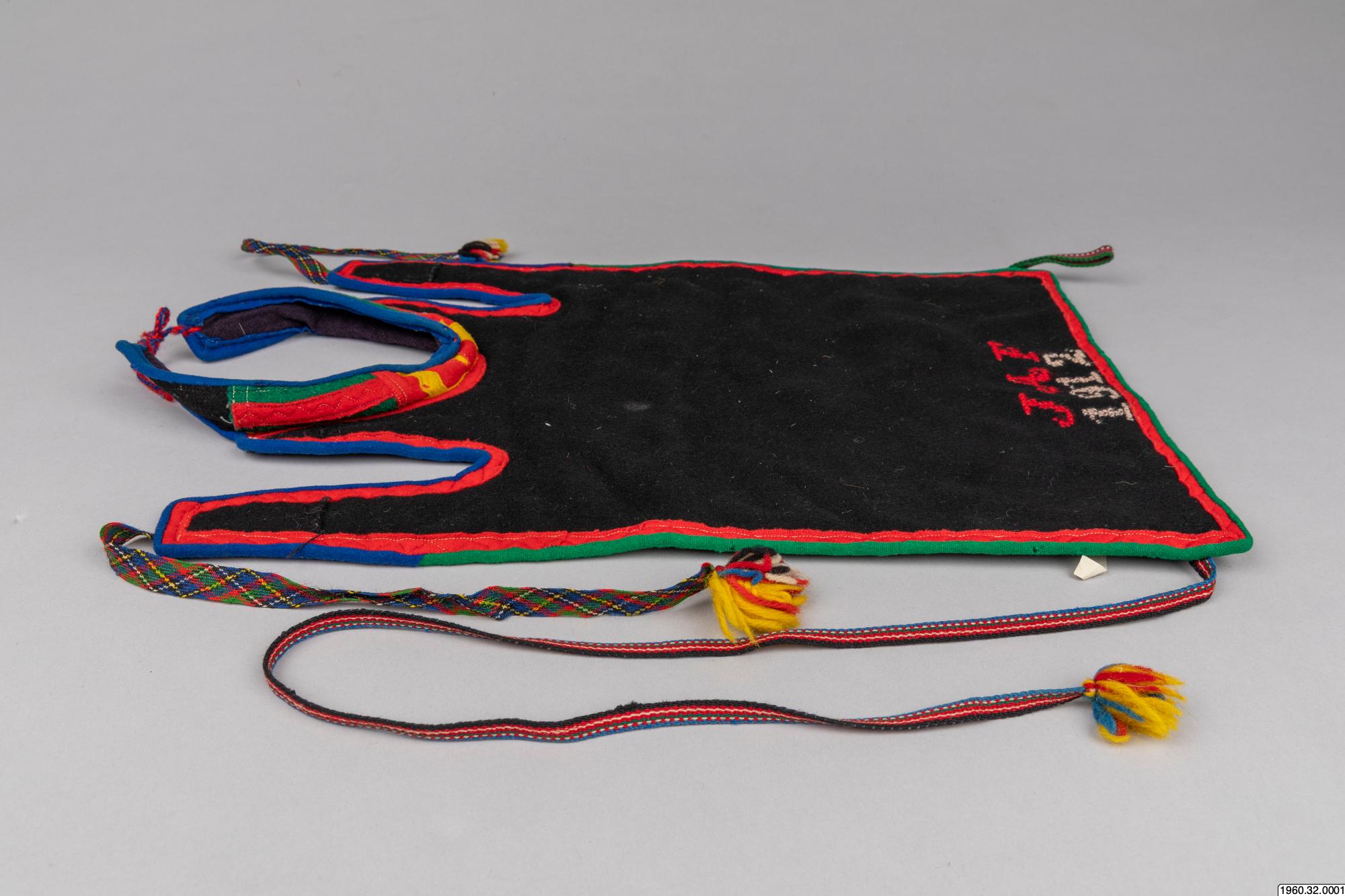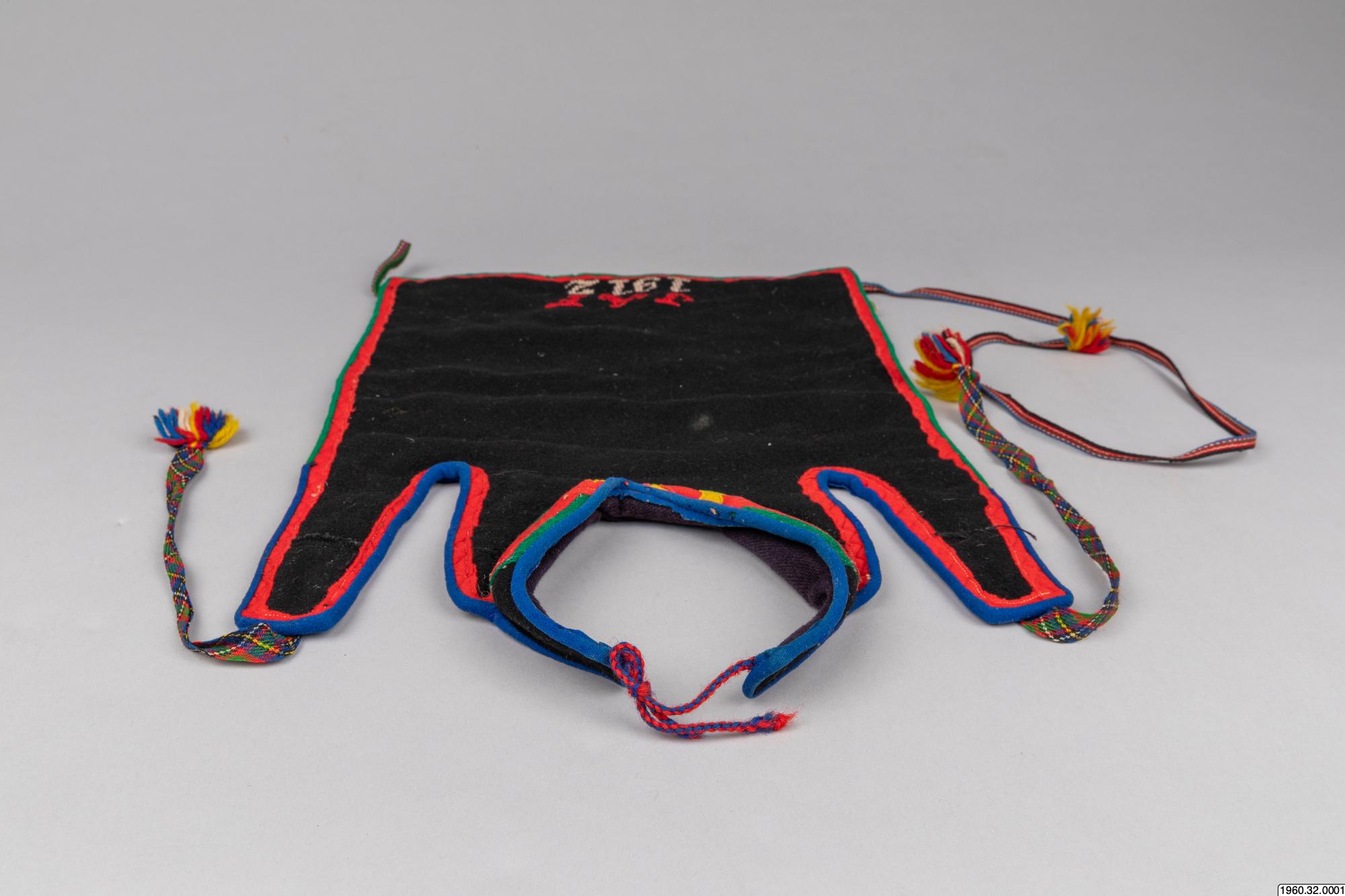 Barmkläde, vars framsida består ett svart vadmalsstycke. På baksidan fodrat med ett mörkblått tygstycke närmast av halvyllekaraktär. I kanterna och vid halslinningen bårder av rött, grönt, blått och gult tyg, vid halslinningen i applikationsteknik. Längst ner på framsidan korsstygnsbroderi i rött och vitt garn: initialerna "JAF" och "1912". Försett med band och snoddar för fastsättning. Banden ha...