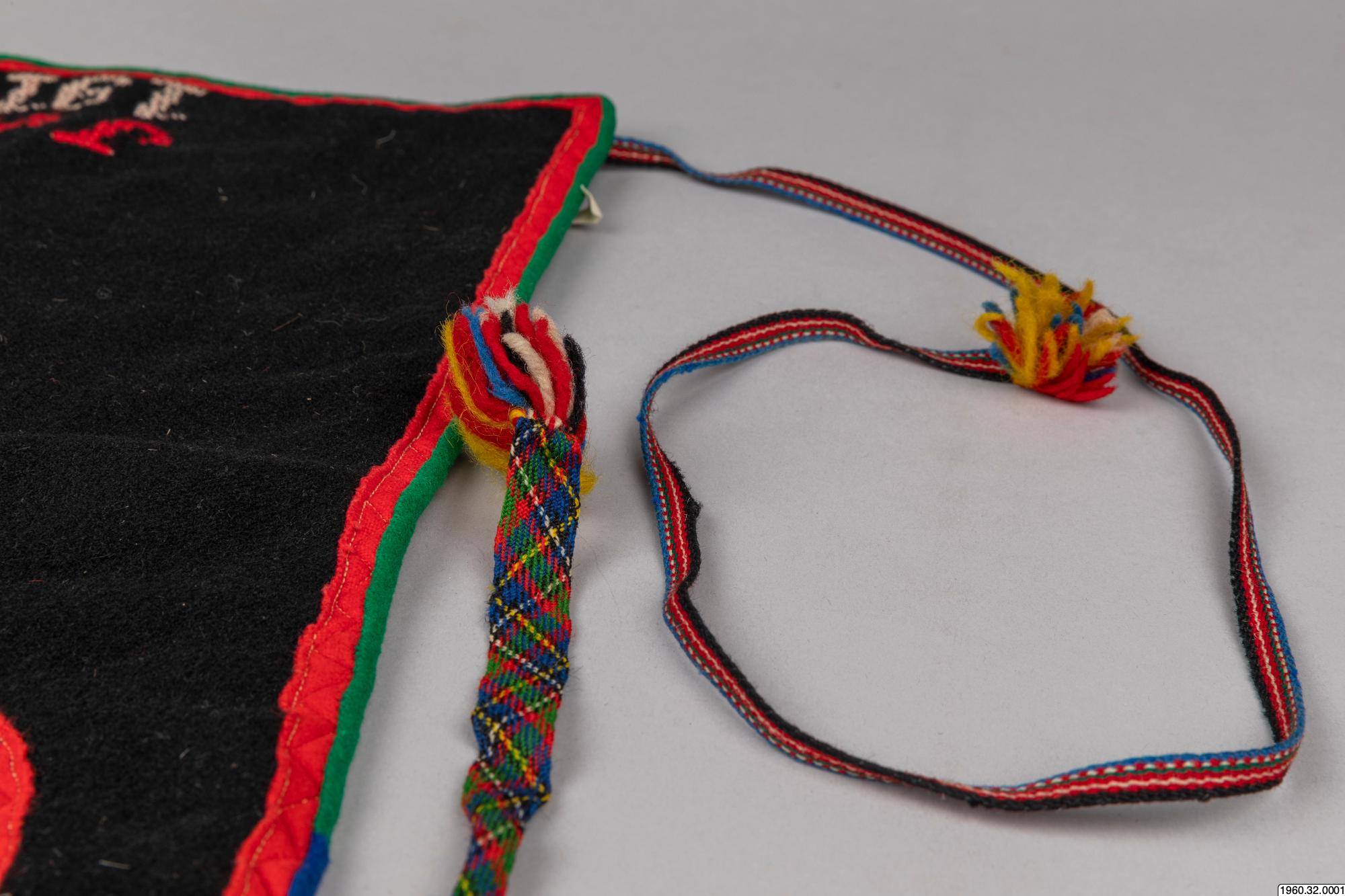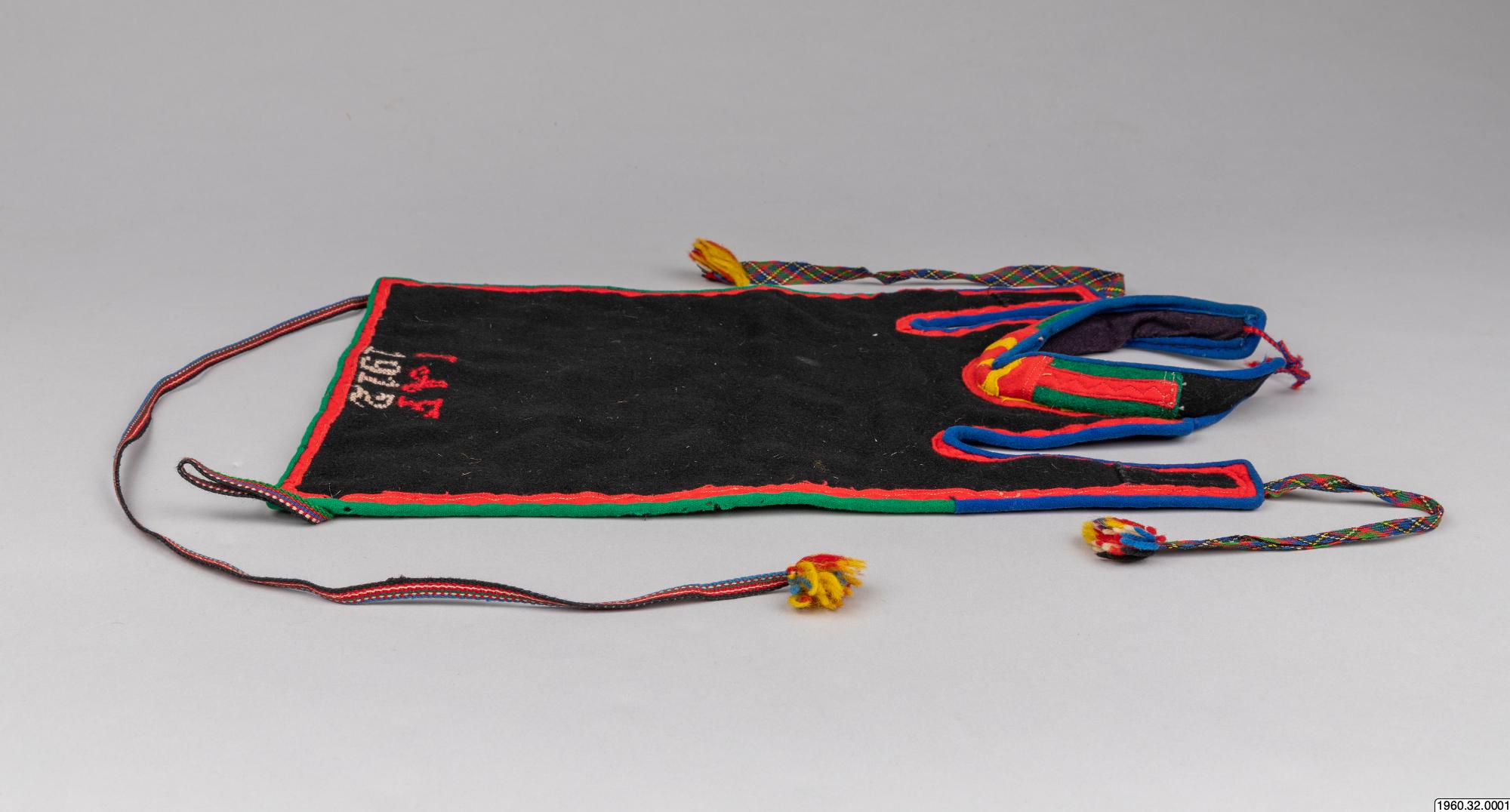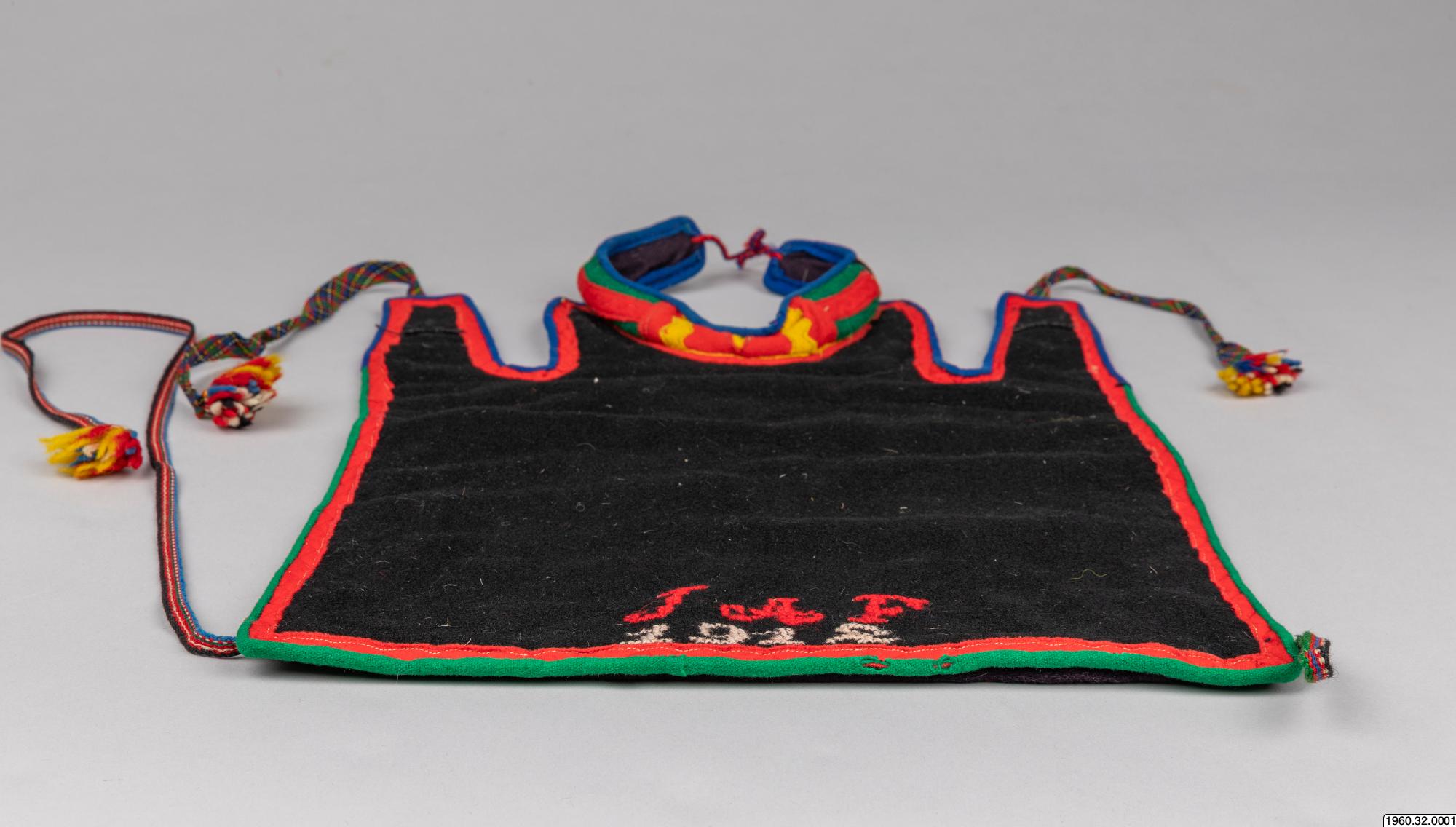 Barmkläde, vars framsida består ett svart vadmalsstycke. På baksidan fodrat med ett mörkblått tygstycke närmast av halvyllekaraktär. I kanterna och vid halslinningen bårder av rött, grönt, blått och gult tyg, vid halslinningen i applikationsteknik. Längst ner på framsidan korsstygnsbroderi i rött och vitt garn: initialerna "JAF" och "1912". Försett med band och snoddar för fastsättning. Banden har i ändarna tofsar. Initialerna avser samen J. Amma Finnberg, född 1888, av vilken insamlaren erhöll klädet sommaren 1960. Denne vistades då i Ålderdomshemmet, Jokkmokk. Barmklädets längd: 43 cm.