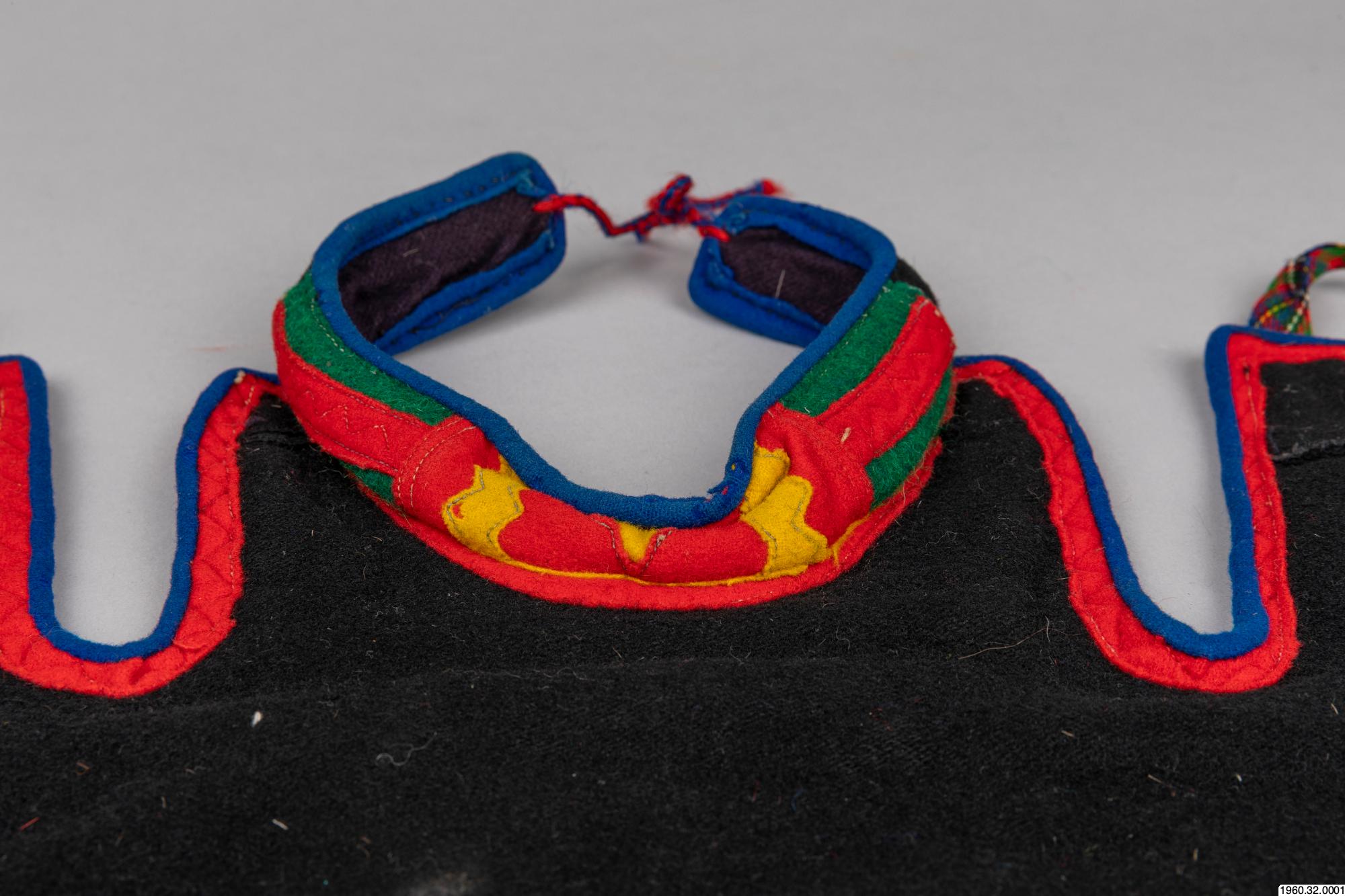 Om barmklädet: Innan man fick moderna underkläder bar man under koltens bröstglip ett chemisettliknande plagg fäst runt halsen, det s.k. barmklädet liehppa (n.sam.) eller sliehppa (l.sam). Hos de centrala och sydliga samerna utvecklade man detta plagg med flerfärgade applikationer och broderier i vackra mönster. Till festligheter och bröllop hängde man fast åtskilliga smyckespännen på barmklädet. De nordliga samerna höll sig till mjuka, enkla barmkläden och gömde dem istället under en halsduk, som kunde vara av siden vid högtider. (Manker, 1947: 165f) Relaterade sökningar: Register: [alla] FOLNAM: samer OBJTXT [innehåller]: personliga föremål klädesplagg barmkläde Referenser: Manker, Ernst. De svenska fjällapparna. STF:s handböcker om det svenska fjället nr 4, Svenska Turistföreningens förlag: Stockholm, 1947. Phebe Fjellströms bok Samernas samhälle i då och nutid. Nordstedts: Stockholm, 1985. ISBN 91-1-853222-5. Finns på VKM’s bibliotek. (av Madeleine Stirnimann, socialantropolog VKM Göteborg, 2010)