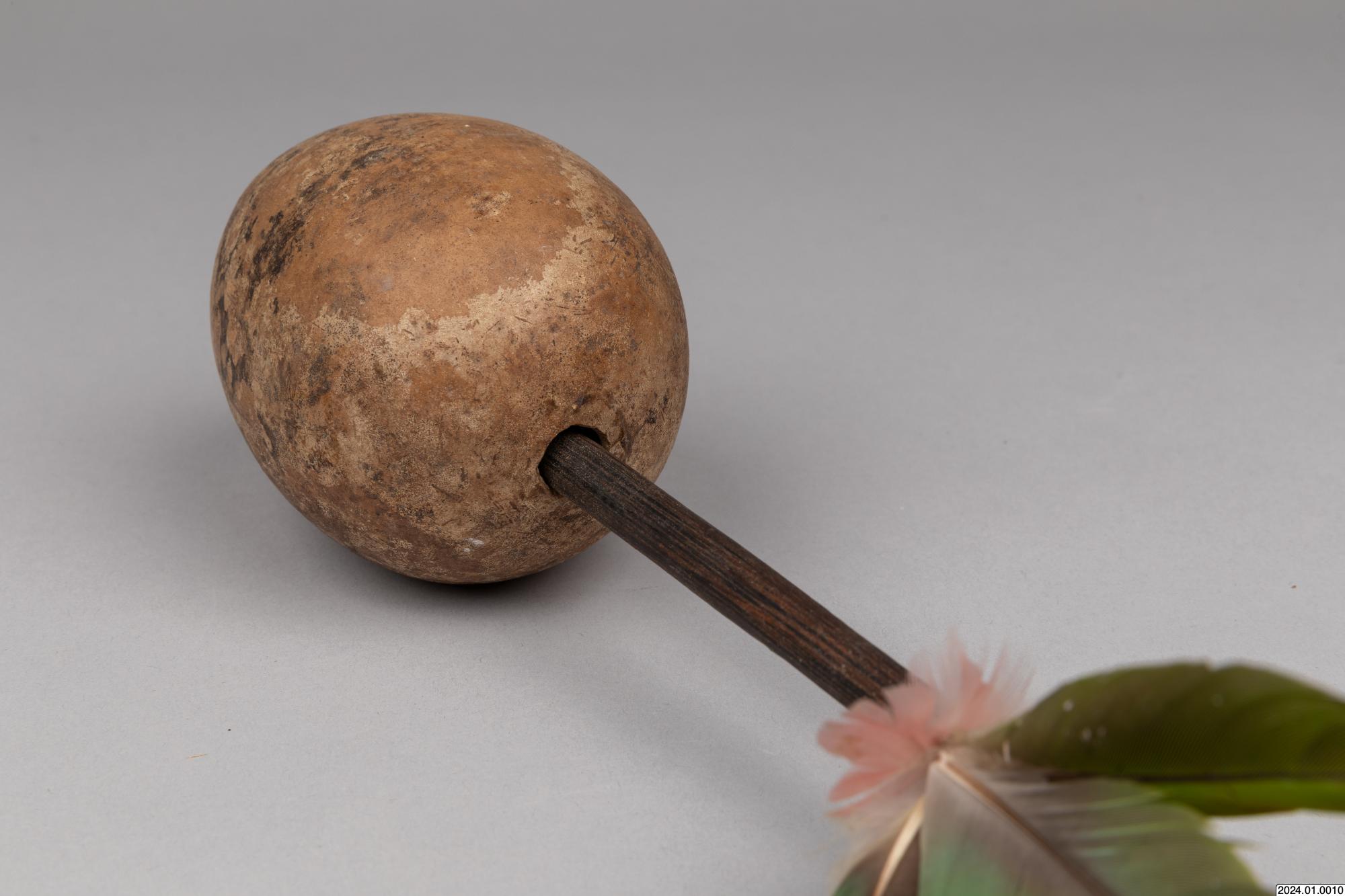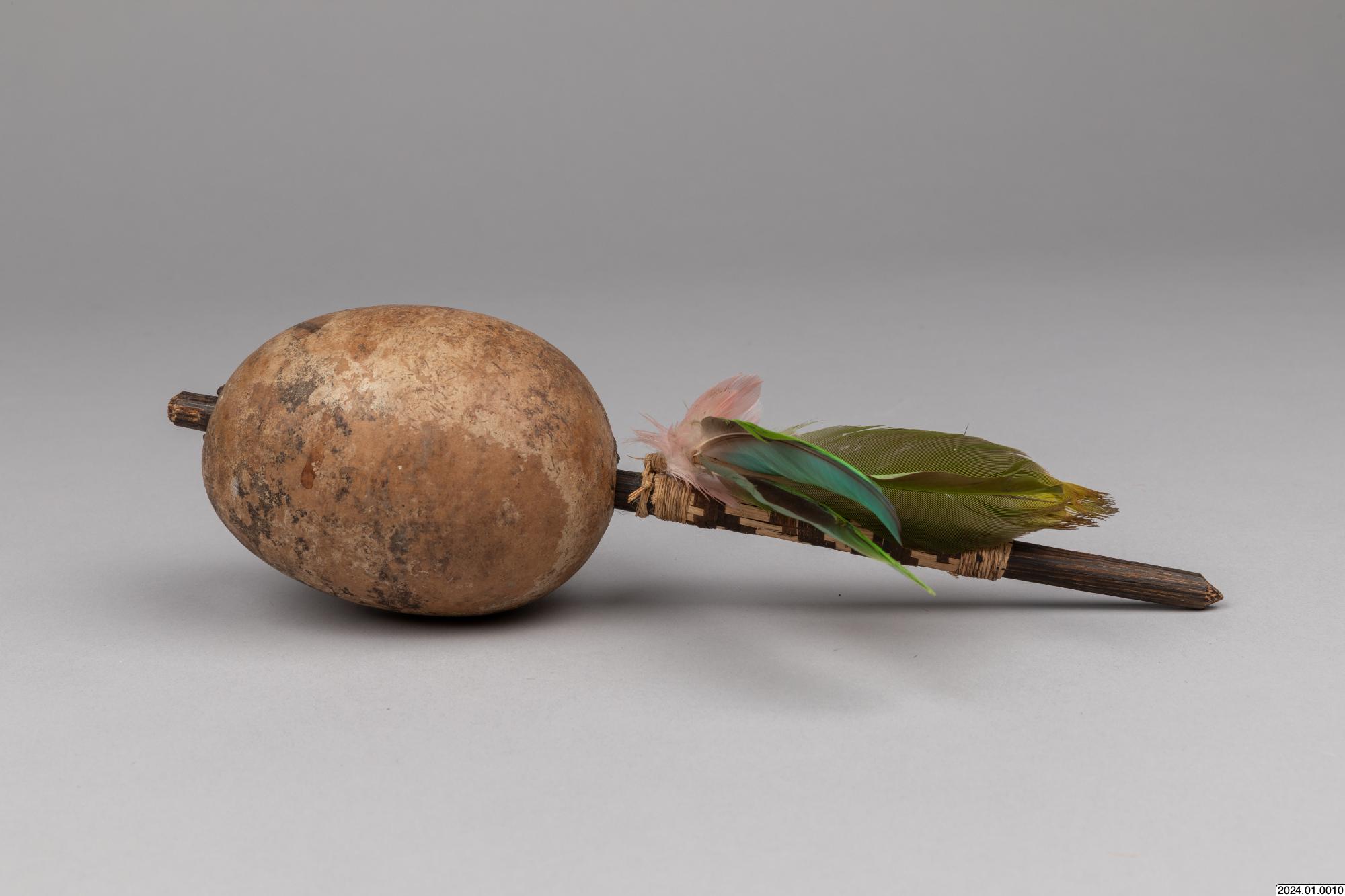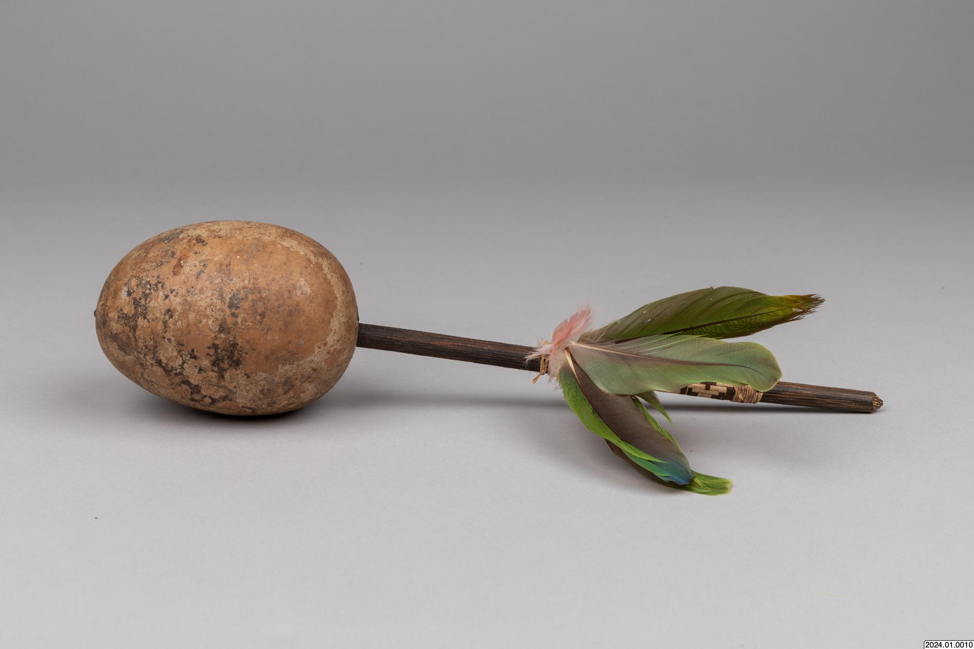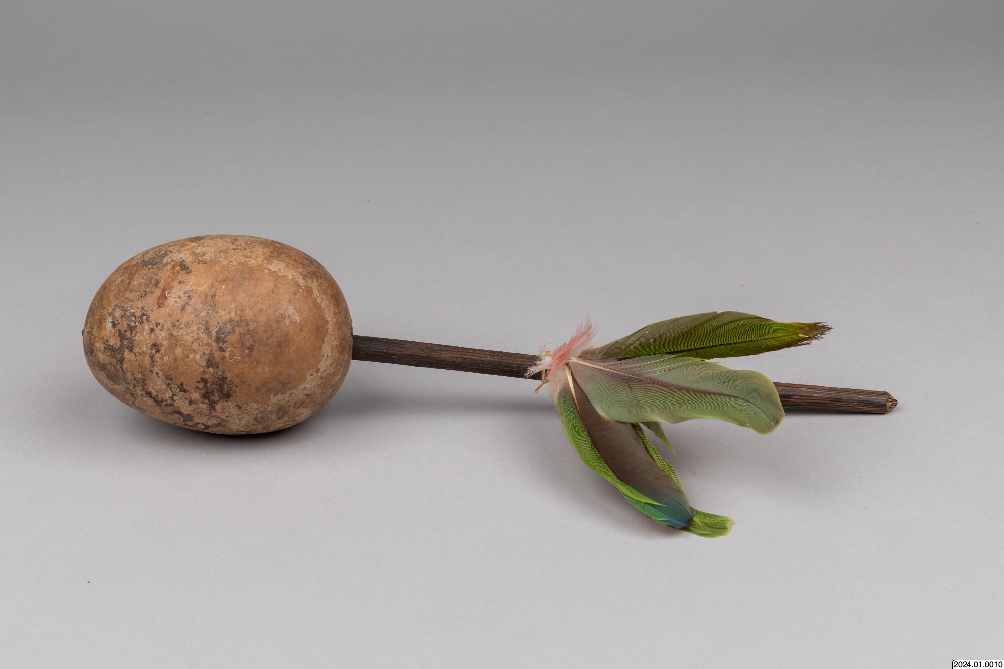 Till formen äggliknanade ihåligt brunt föremål. Skaft med flätad bastliknande dekoration i svart och ofärgat material. Hänge eller knippe med gröna och rosa fjädrar.