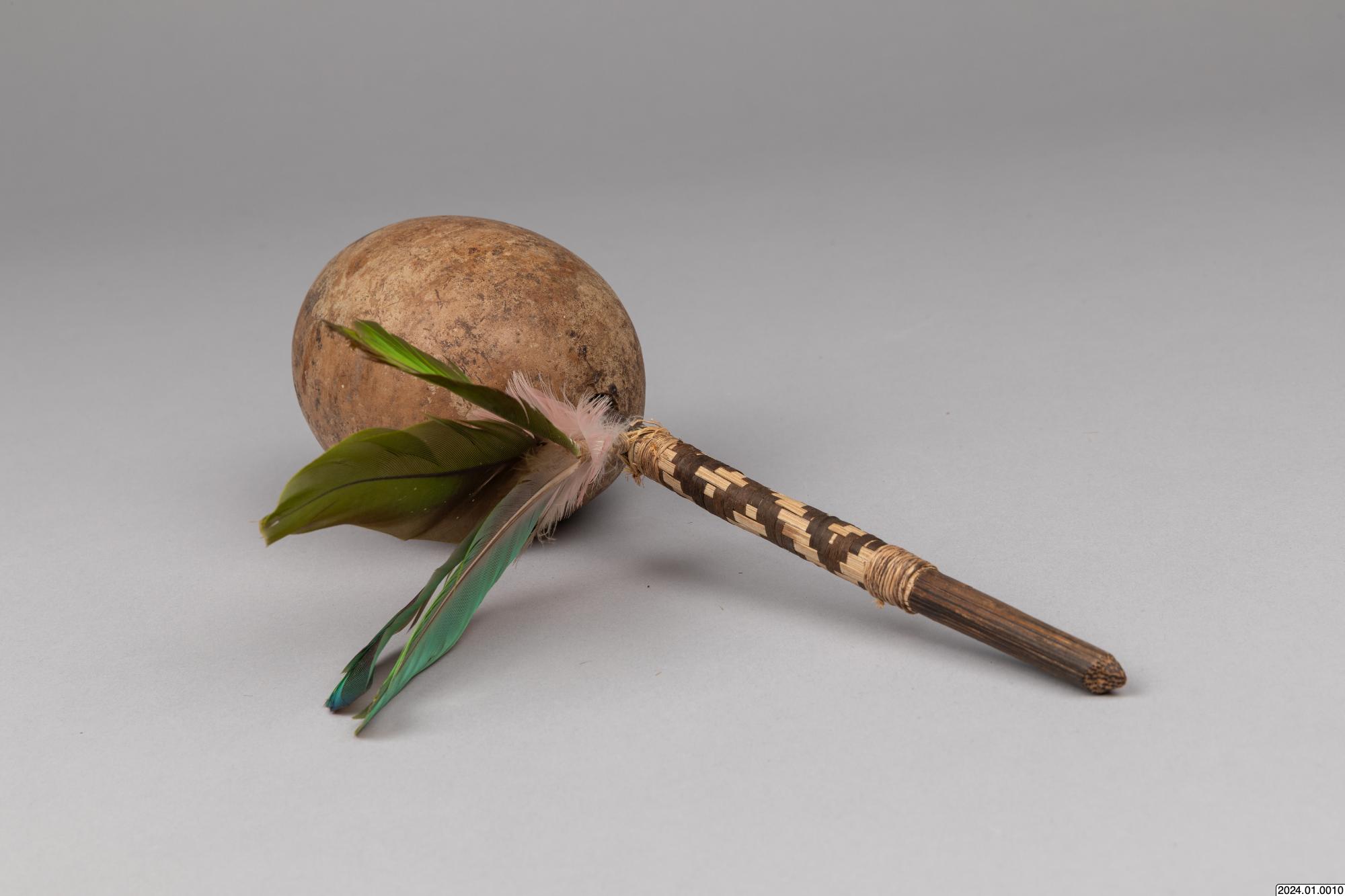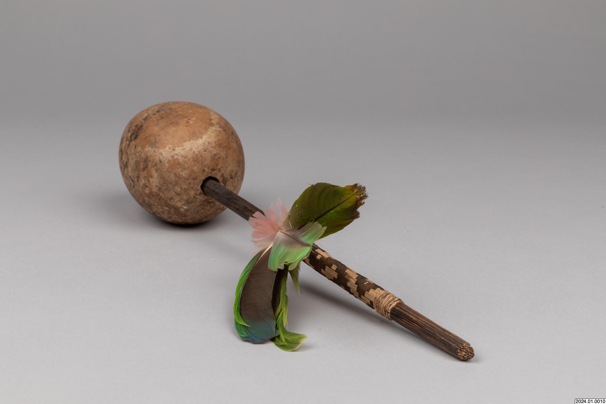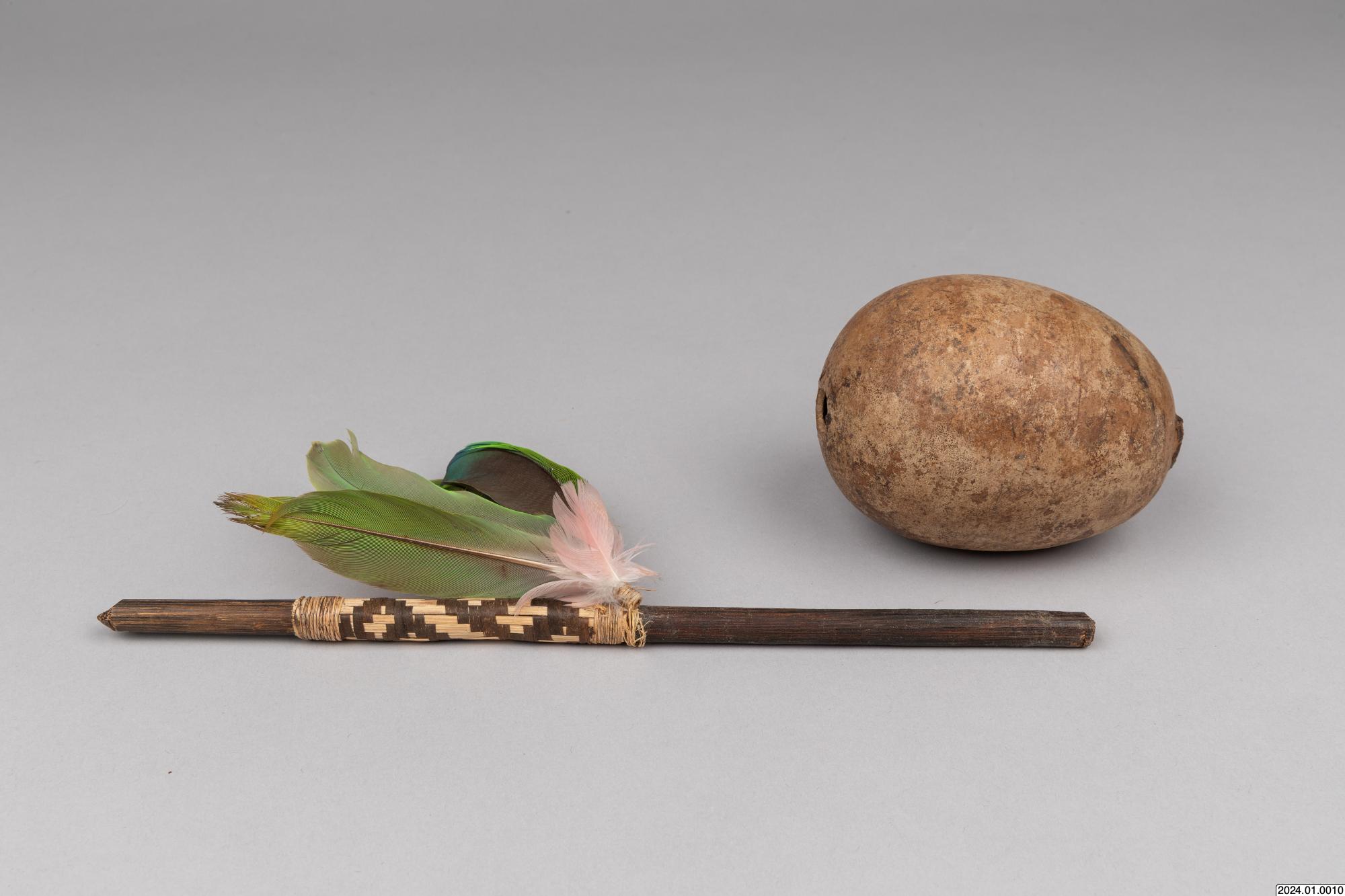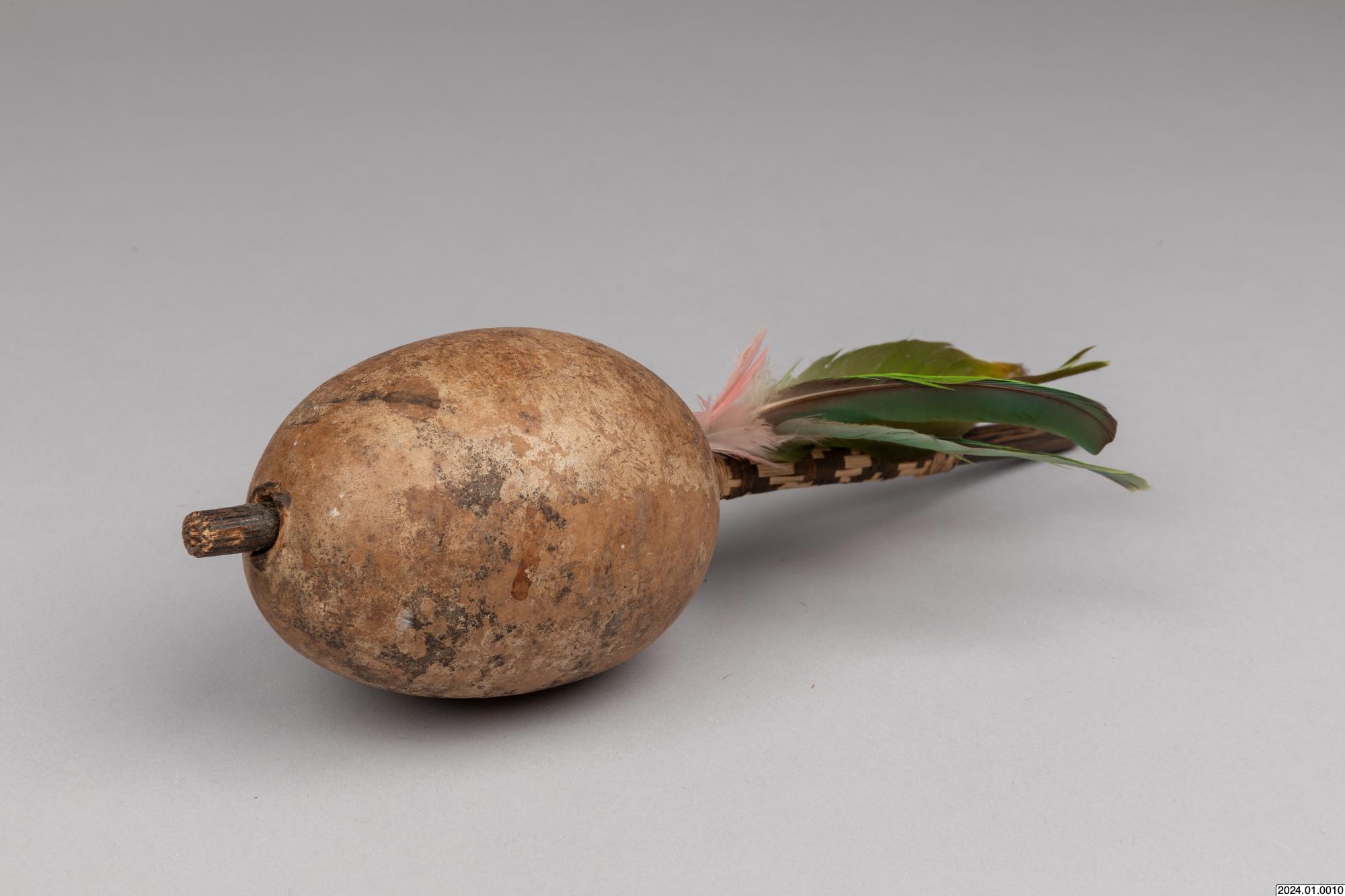 Till formen äggliknanade ihåligt brunt föremål. Skaft med flätad bastliknande dekoration i svart och ofärgat material. Hänge eller knippe med gröna och rosa fjädrar.