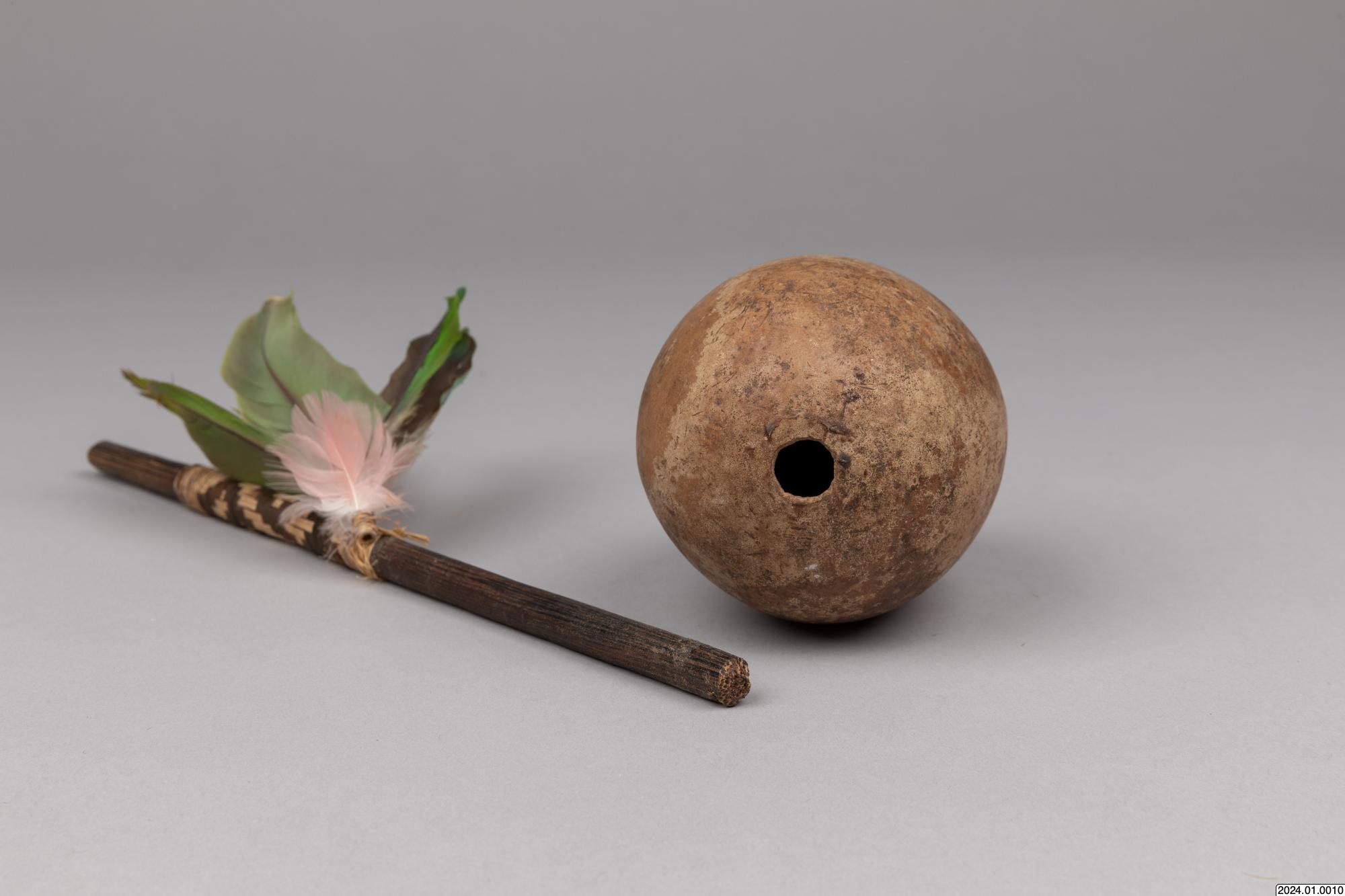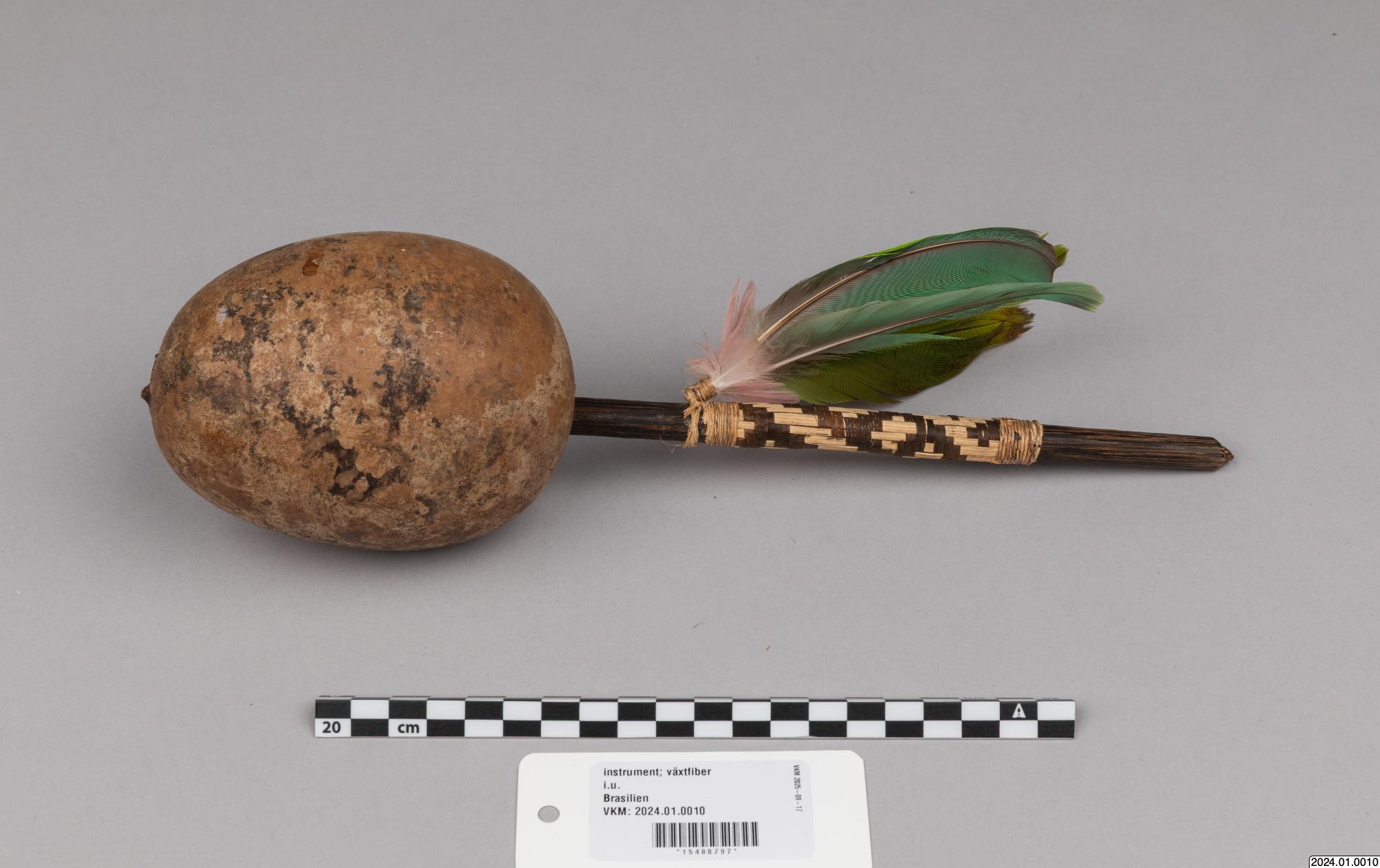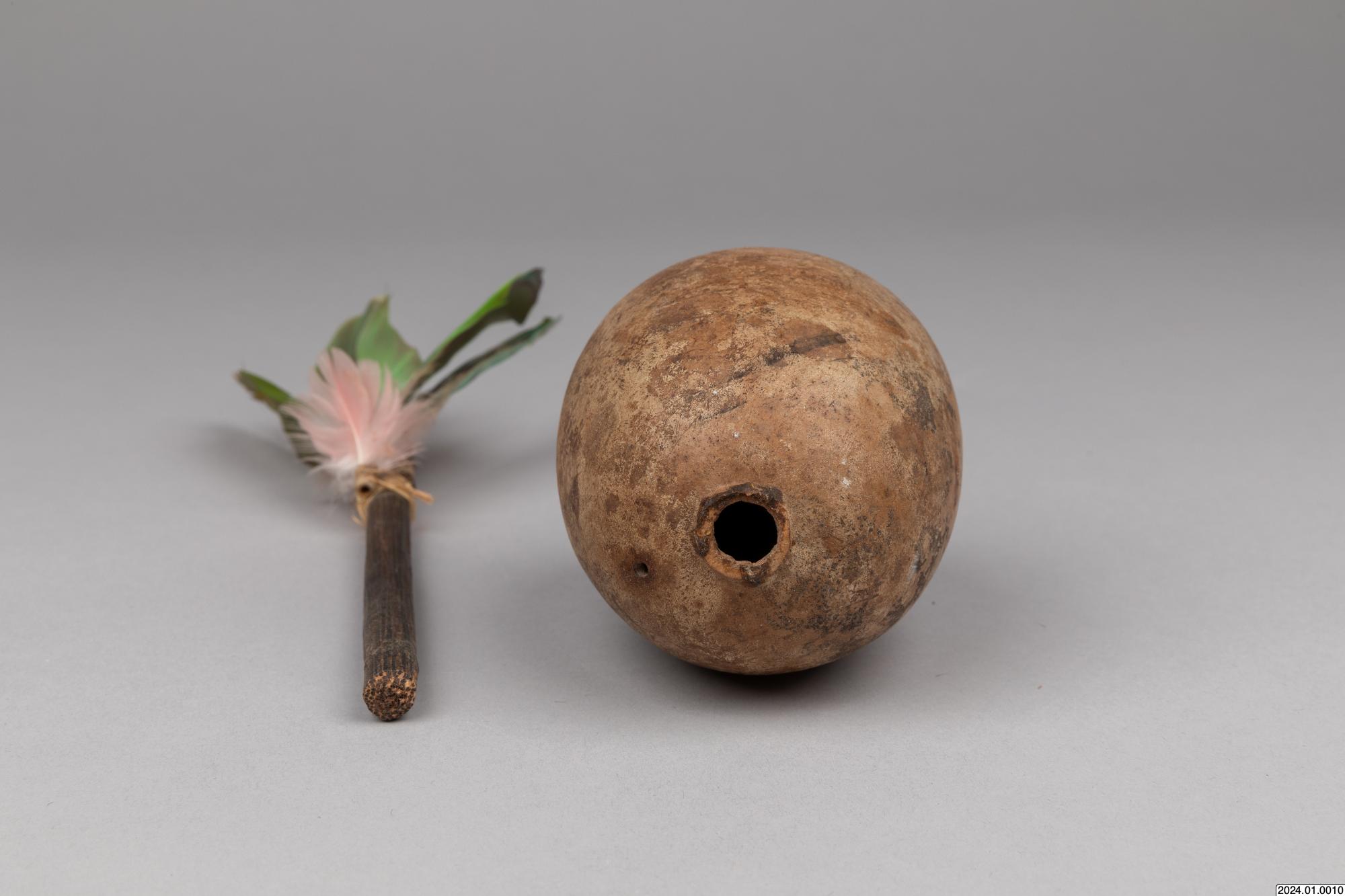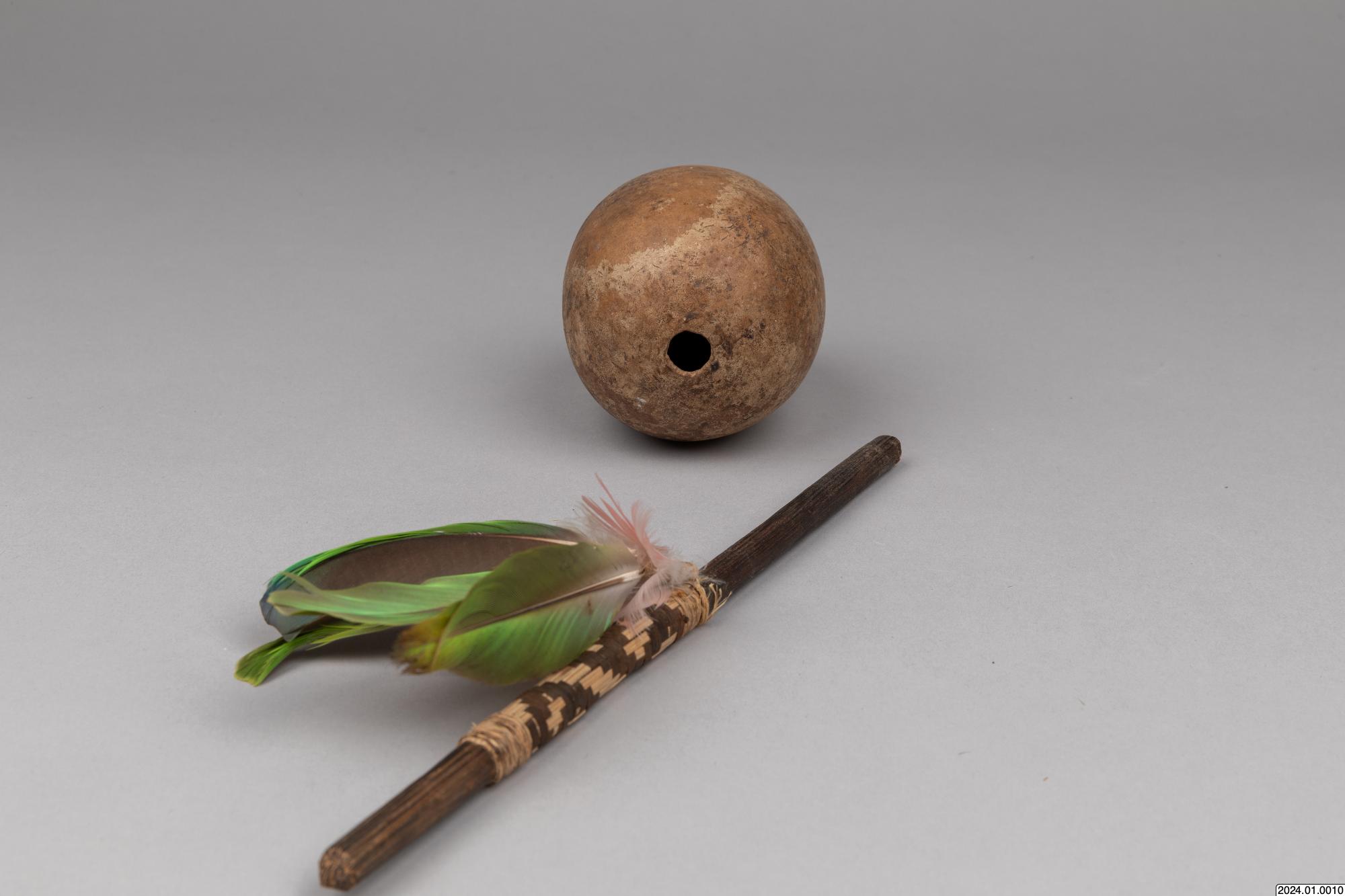 Till formen äggliknanade ihåligt brunt föremål. Skaft med flätad bastliknande dekoration i svart och ofärgat material. Hänge eller knippe med gröna och rosa fjädrar.